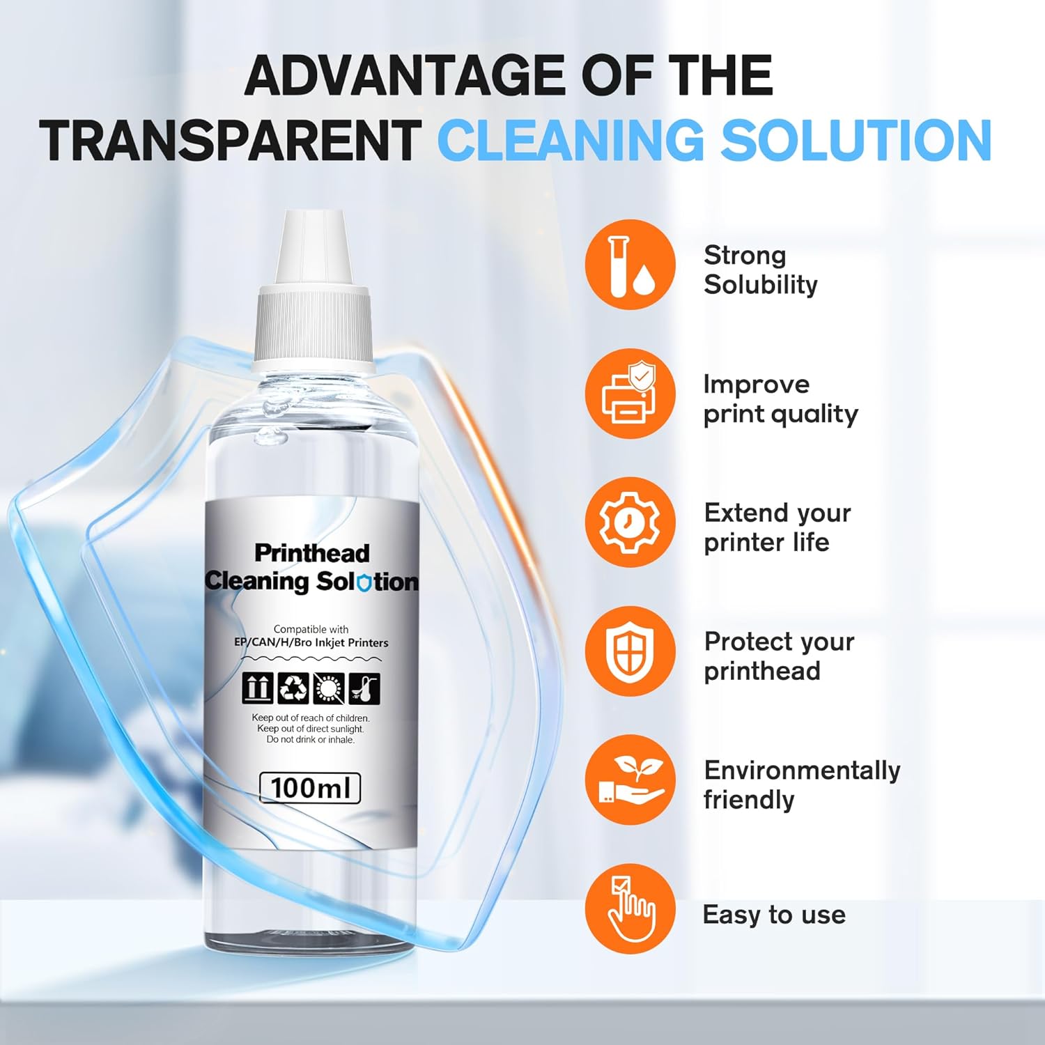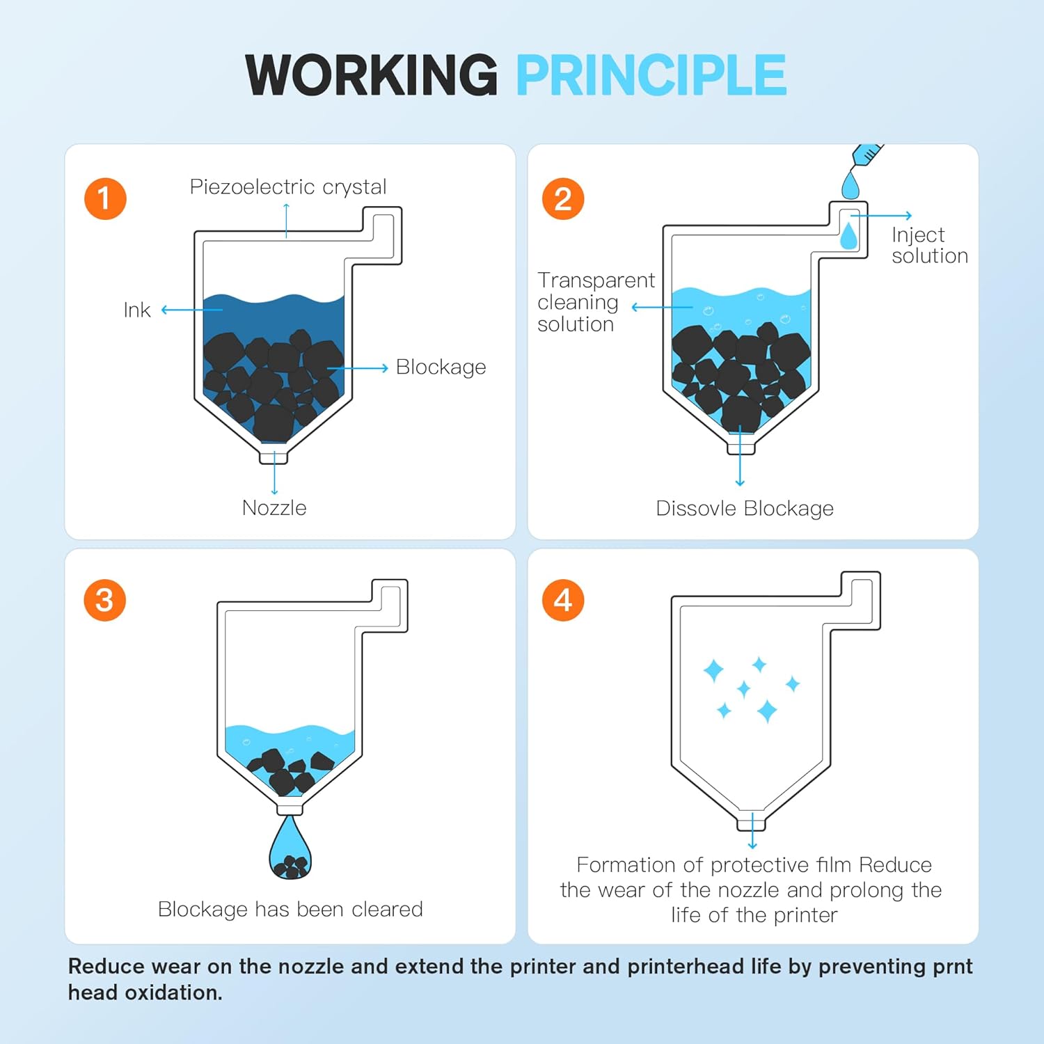 - γExcellent Cleaning Abilityγ Repair unclog cleaning kit contains enzymes, which can strongly dissolve and clean dry ink, wet and protect the print head. The degradation factor can strongly dissolve the hard block and other soluble impurities left after the ink hardens, making the ink flow more smoothly, protect your printhead and extend your printer life.