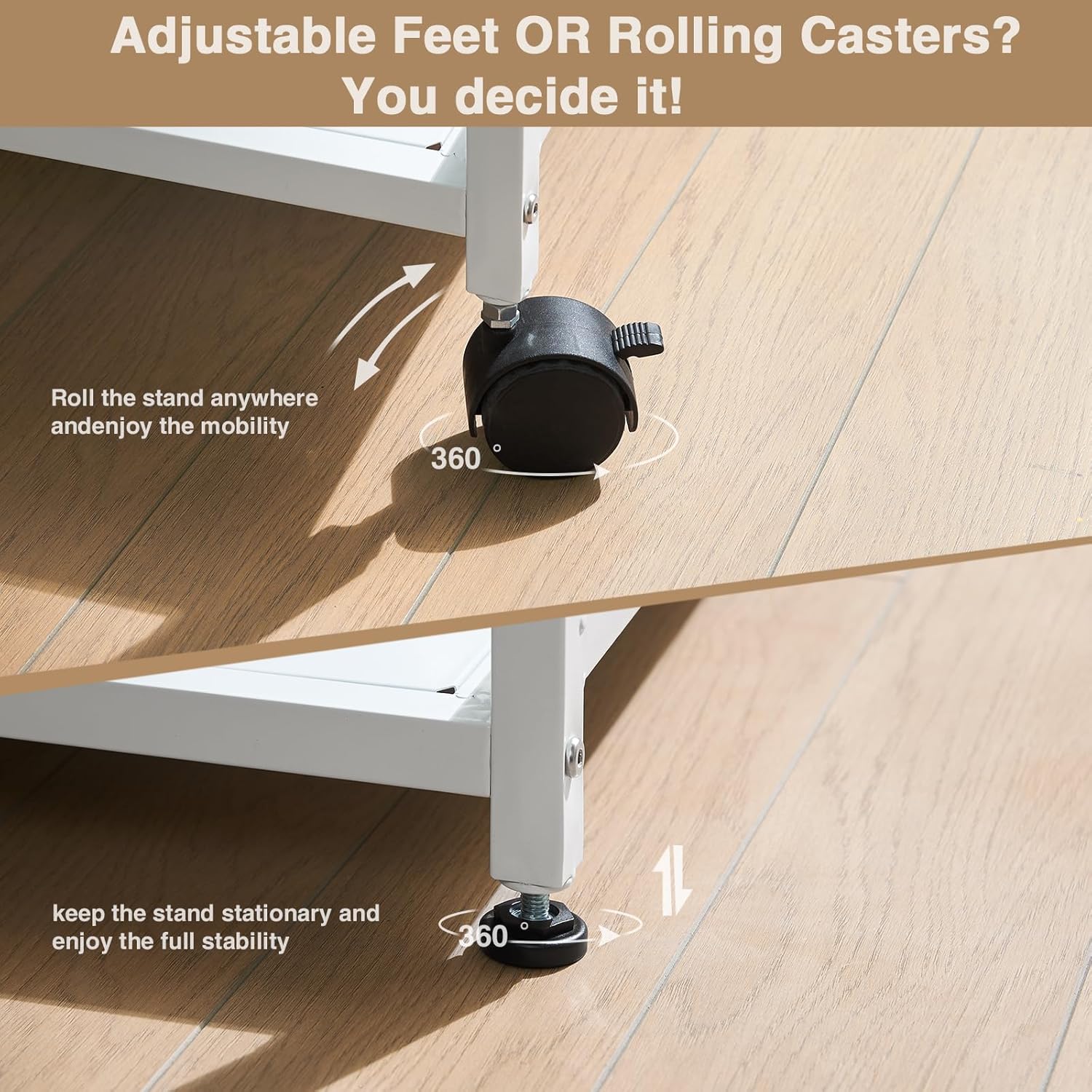 - Easy to Move & Stable When Stationary:The printer stand with storage has 4 wheels that can rotate 360Β°, and you can push the printer stand to wherever you want. 2 of the 4 wheels can be locked, allowing flexible movement while maintaining sufficient stability in the placement position of the printer stand. The printer stand also comes with 4 Adjustable Feet for you to choose upon your needs