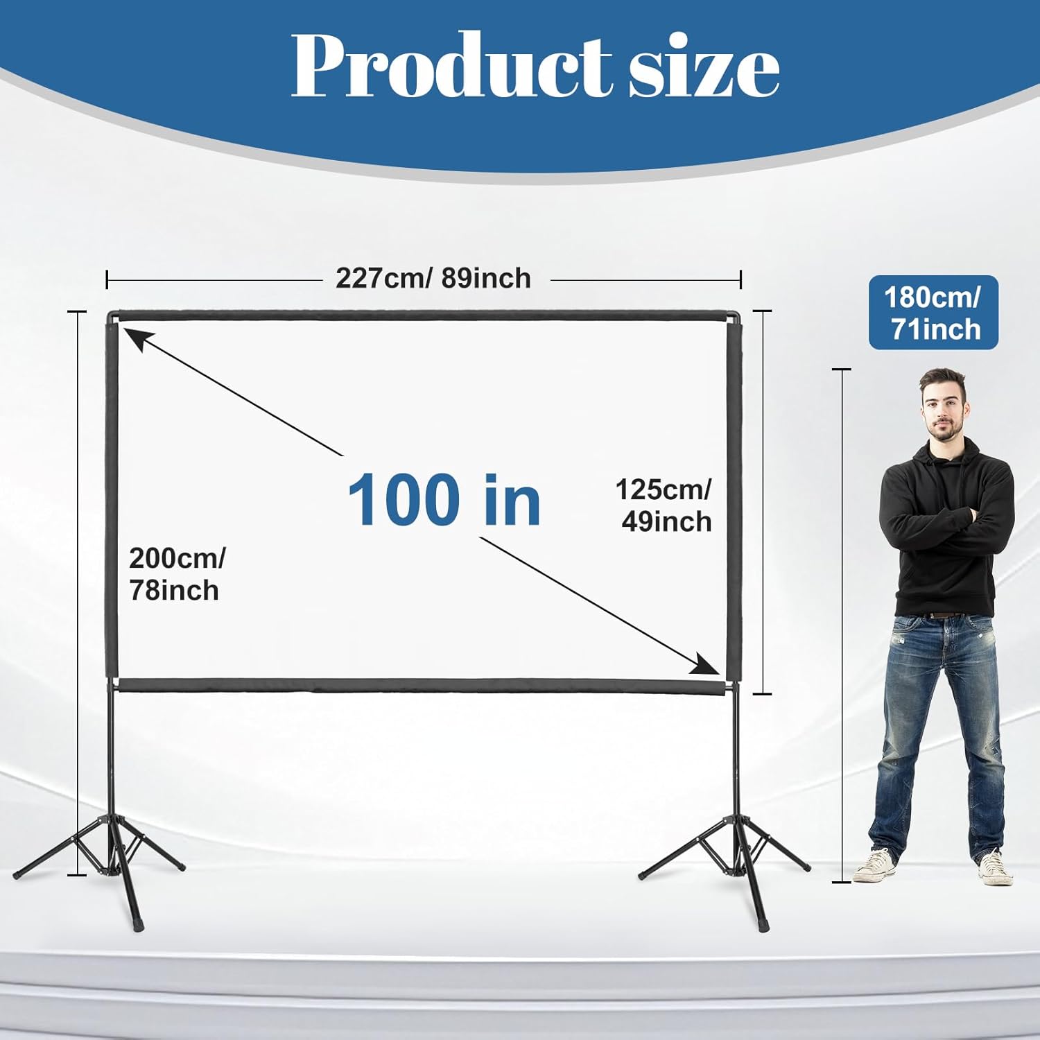 - 【Detachable Tripod】The projector screen stand is not easily bent, deformed, or broken, and the base design with a larger footprint increases its stability, sturdiness, and resistance to tipping. The height can be adjusted freely between 45-200cm/17-78inch.