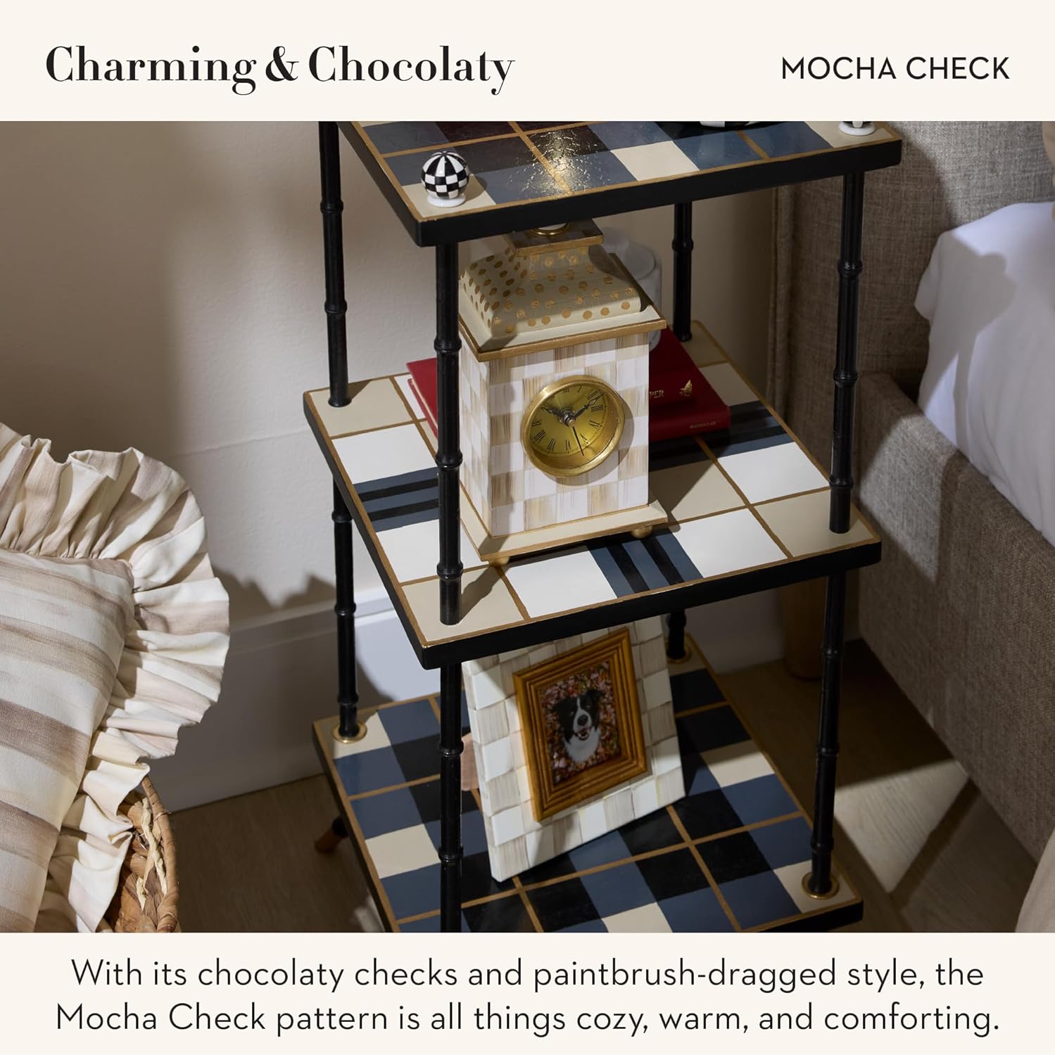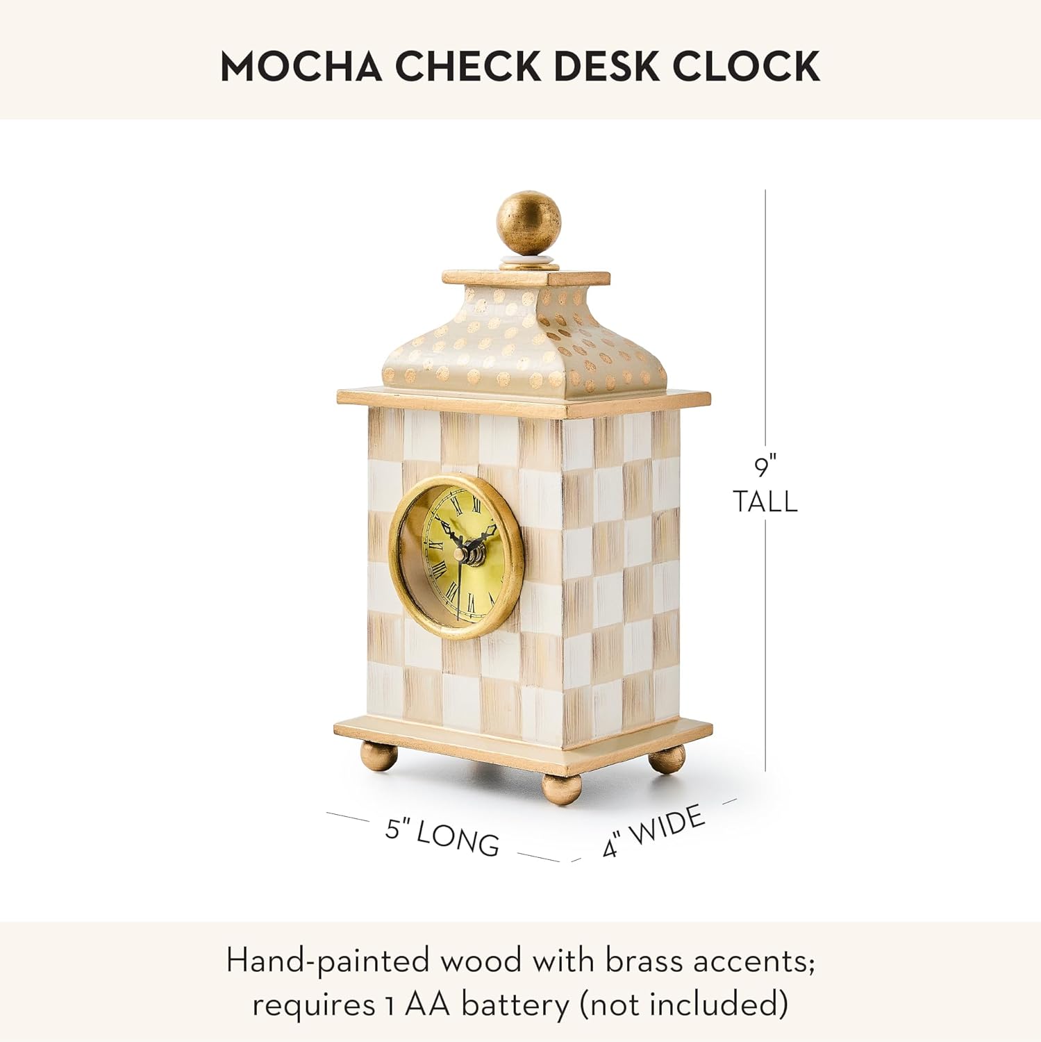 - ELEGANT HOME & OFFICE DECOR: Discover what refined design can do for your home or office with the wooden MacKenzie-Childs Mocha Check Desk Clock. The brass accents blend well with the warm brown-and-white checkered pattern for a classic timekeeper.