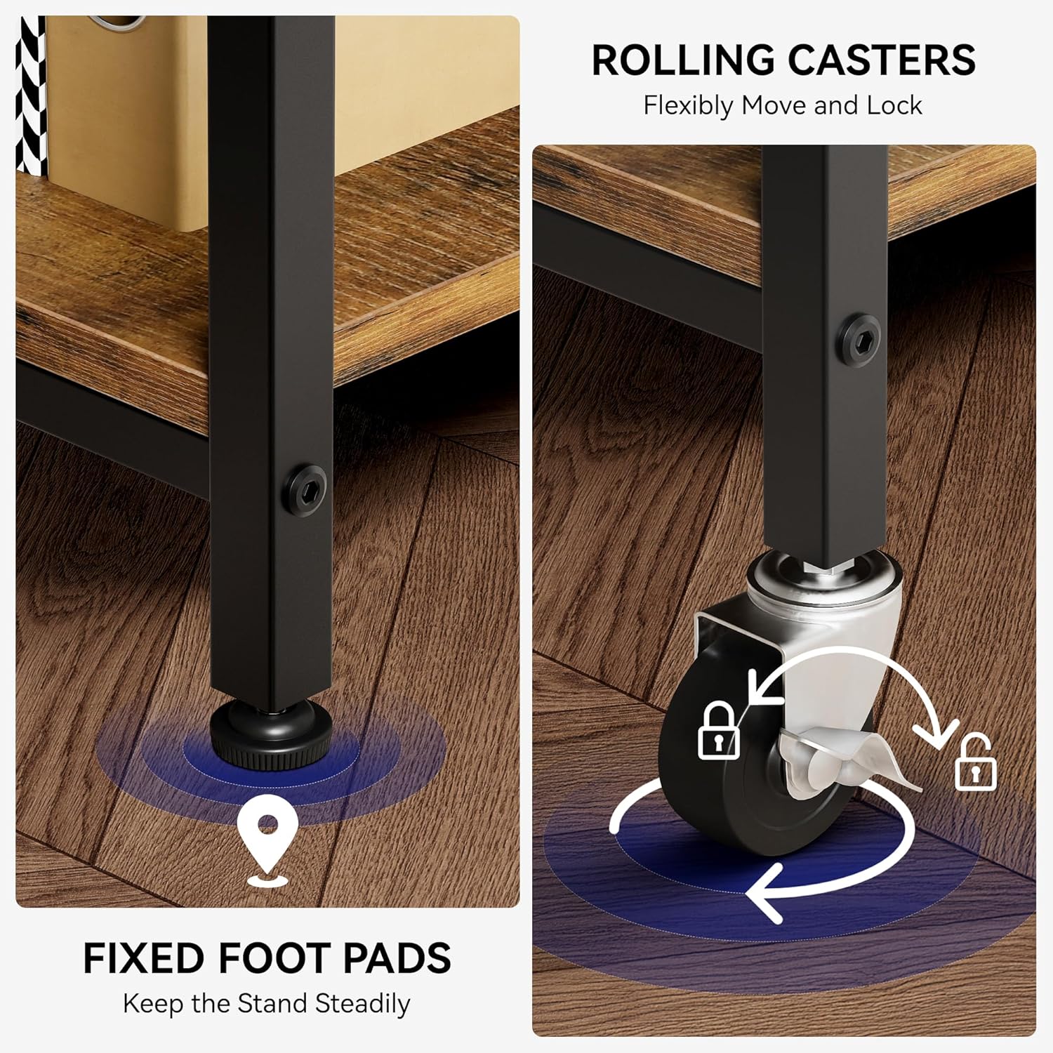 - 【Rolling Printer Stand with Adjustable Feet】 This 24x24 printer stand come with fixed foot pads and rolling casters, you can choose between full stability or mobility. 2 of the 4 wheels are lockable to keep the printer cart in position. The foot pads can be fine-tuned to prevent wobbling on uneven surfaces, guaranteeing a stable and secure stand.