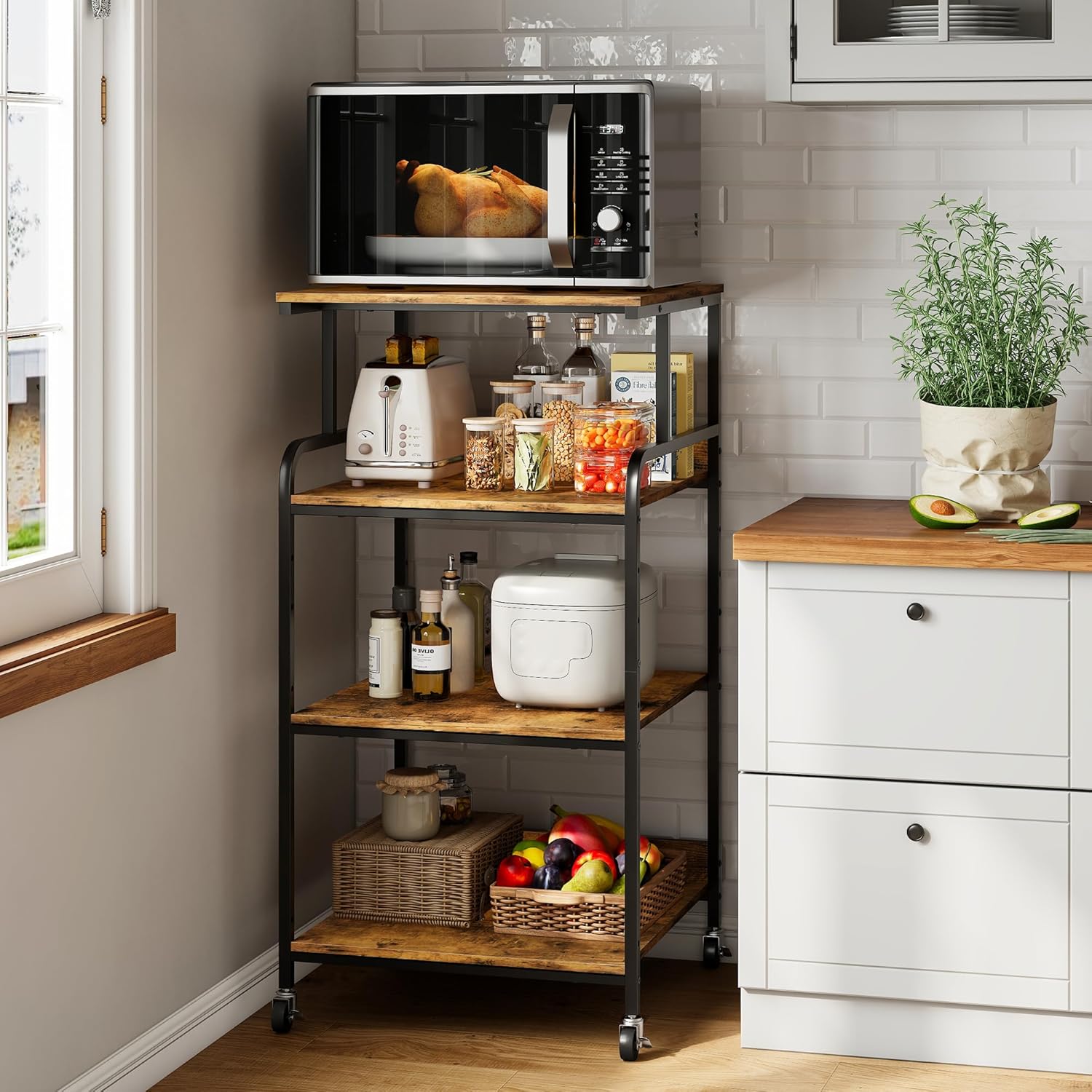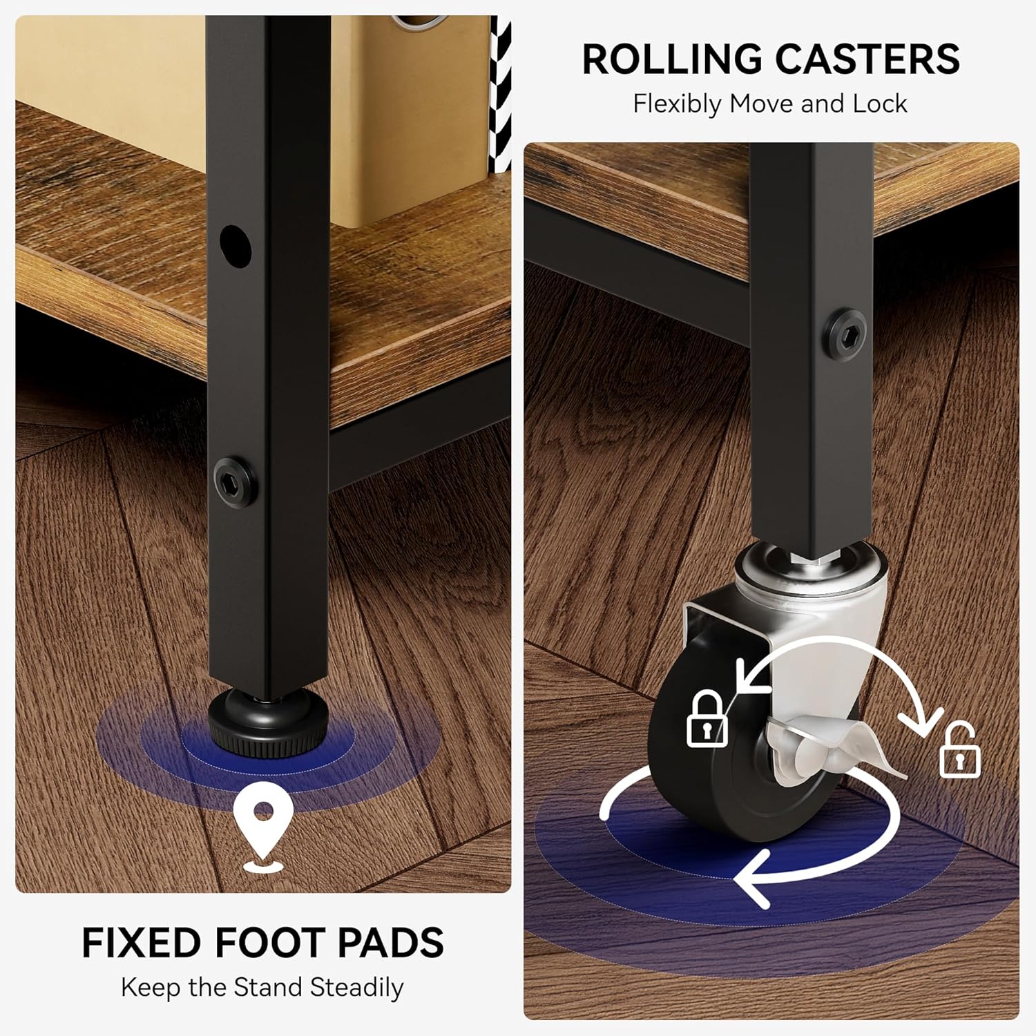 - 【Adjustable Feet and Rolling Casters Both Included】 Come with fixed foot pads and rolling casters, you can choose between full stability or mobility. 2 of the 4 wheels are lockable to keep the printer cart in position. The foot pads can be fine-tuned to prevent wobbling on uneven surfaces, guaranteeing a stable and secure stand.