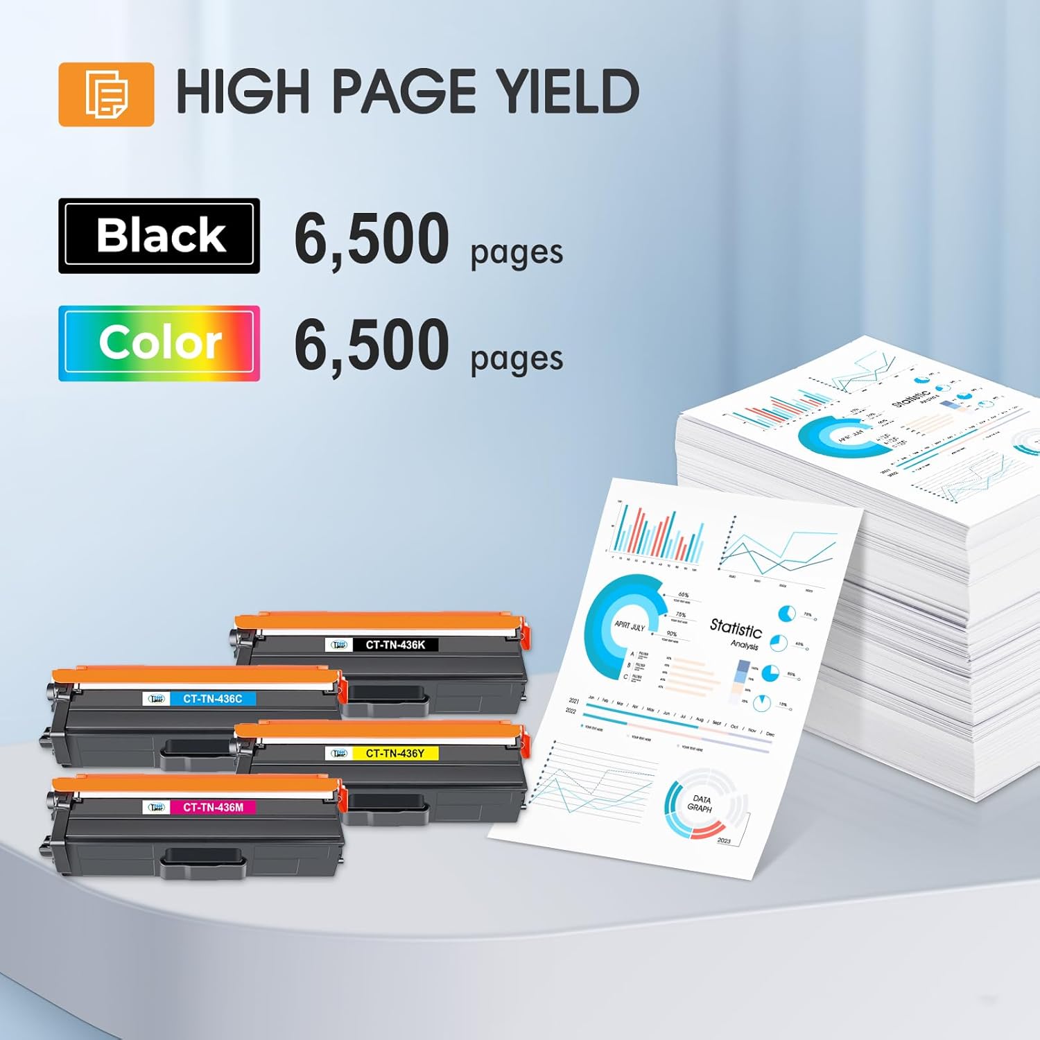 - High Page Yield: Up to 6,500 pages per TN436BK toner cartridge (Letter A4, at 5% Coverage), Up to 6,500 pages per TN436C TN436M TN436Y toner cartridge (Letter A4, at 5% Coverage)