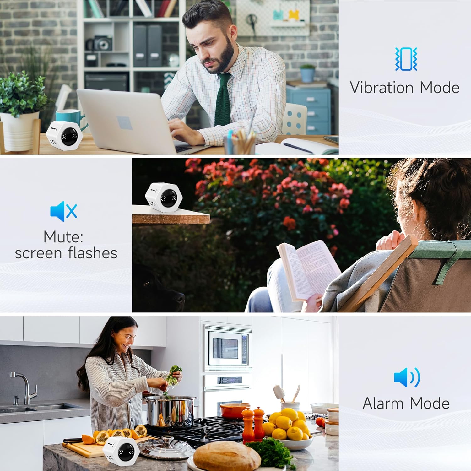 - 🔊【3 Volume Levels】Mute/Vibration/Alarm. In vibration mode, the vibration is noticeable on your desk without disturbing others nearby. Alarm volume: 70-80dB. In mute mode, the screen will flash to remind you, making it suitable for use in the library.