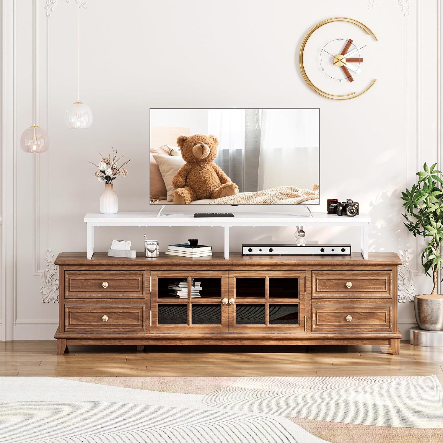 - 【Large TV Riser Stand】- Size: 59”W x 11.8”D x 7.9”H. The large tv shelf can hold flat or curved TV/monitor (up to 75”), monitor stand can hold 2 monitors (up to 37”), ideal for living room, bedroom and office.