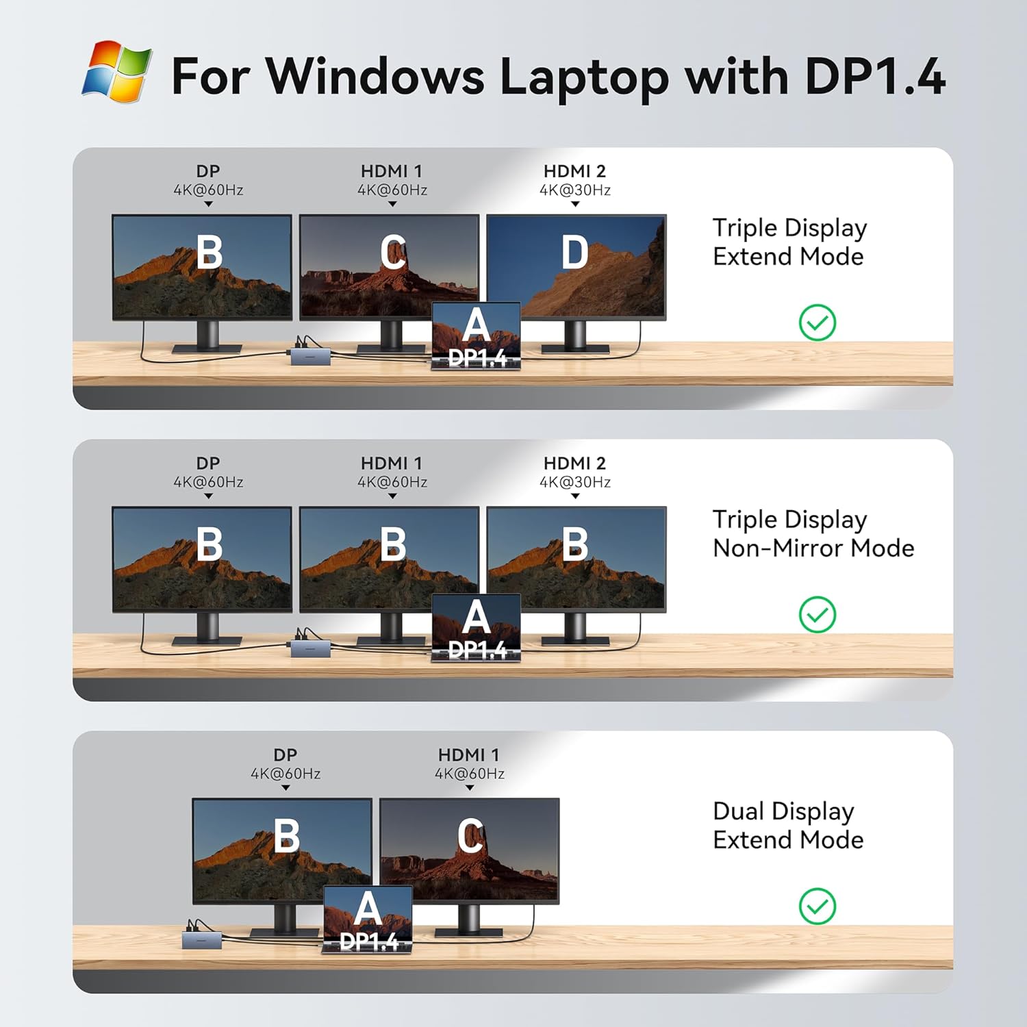 - Triple Screen & Dual 4K Display: With this usb c hub multiport adapter, turn your USB-C laptop (Dell/HP) into a powerhouse with 3-monitor support; β¨When use alone(DP 1.4), Displayport up to 8K@30Hz/4K@144Hz, HDMI port up to 4K@60Hz; Built for creators needing HDMI 2.0 + DP1.4 ports to juggle 8K editing and multi-tasking workflows. Pls note: macOS only supports mirroring mode (SST)