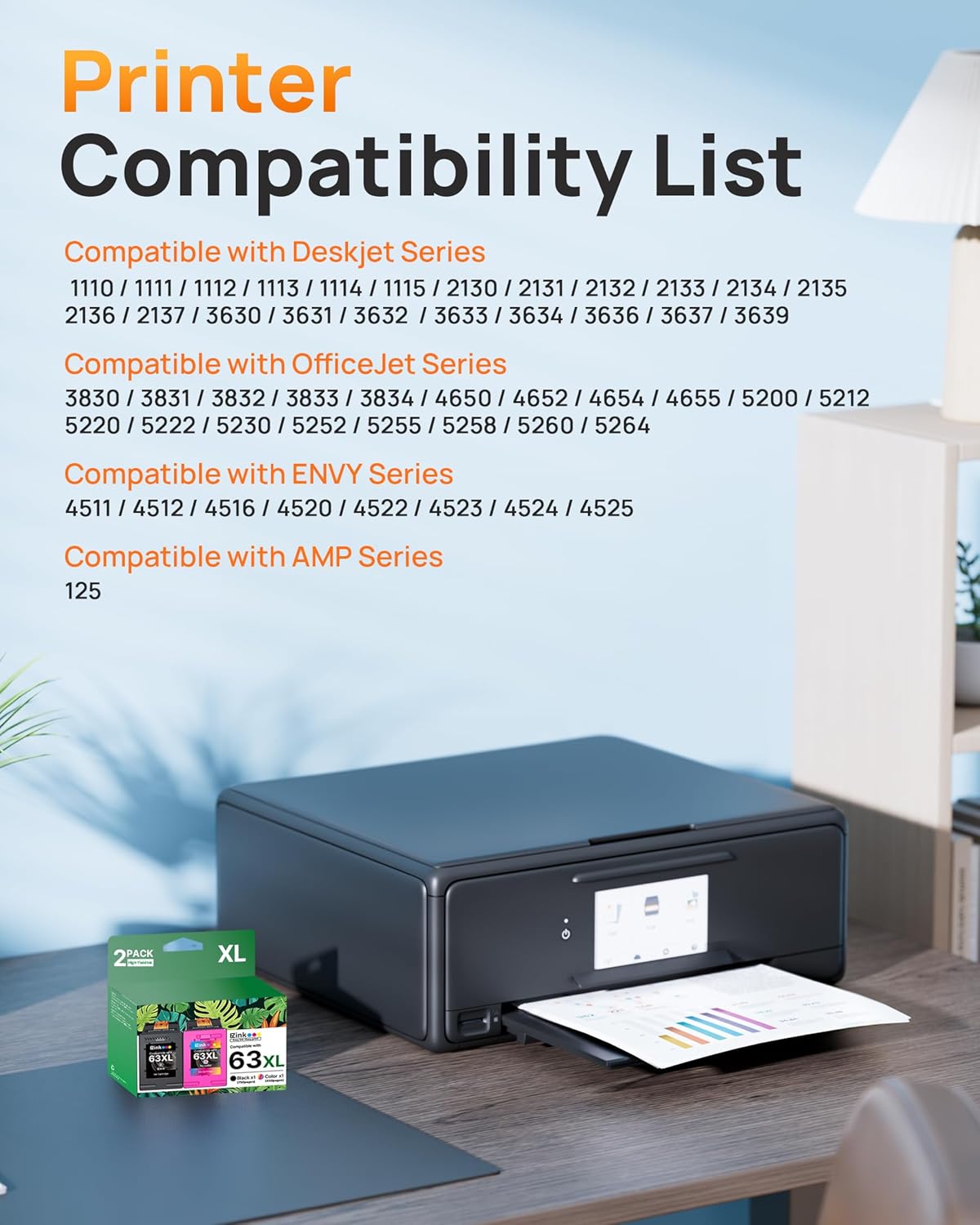 - Package Contents: 1x 63xl black replacement for hp 63xl ink cartridge, 1x 63xl color printer ink, total 2 pack replacement for hp 63xl ink cartridges combo pack with user guide
