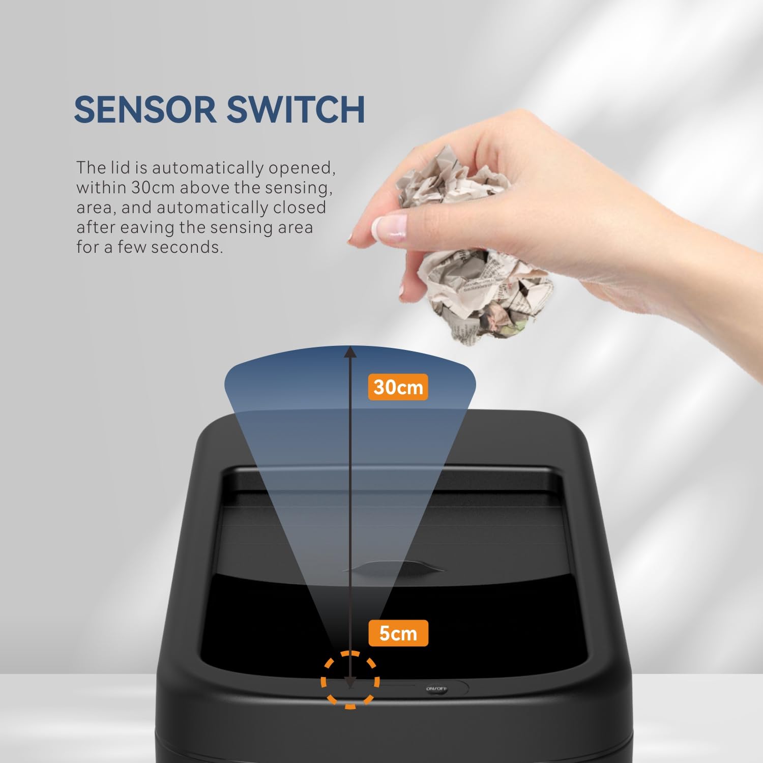 - γPremium Motion Sensor TechnologyγοΌ The touchless kitchen trash can features cutting-edge sensor technology that detects motion within inches, offering a truly hands-free operation. With the touchless operation, you can dispose of kitchen waste without touching the surface of the trash can, maintaining optimum hygiene and preventing cross-contamination.