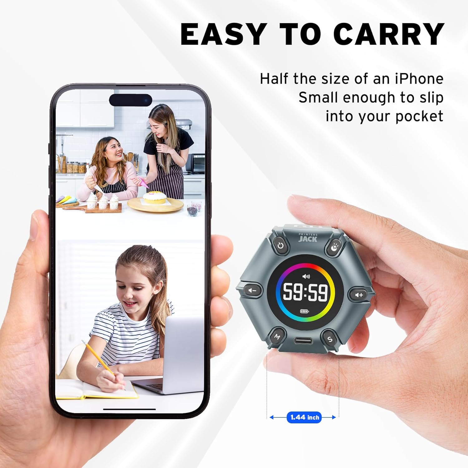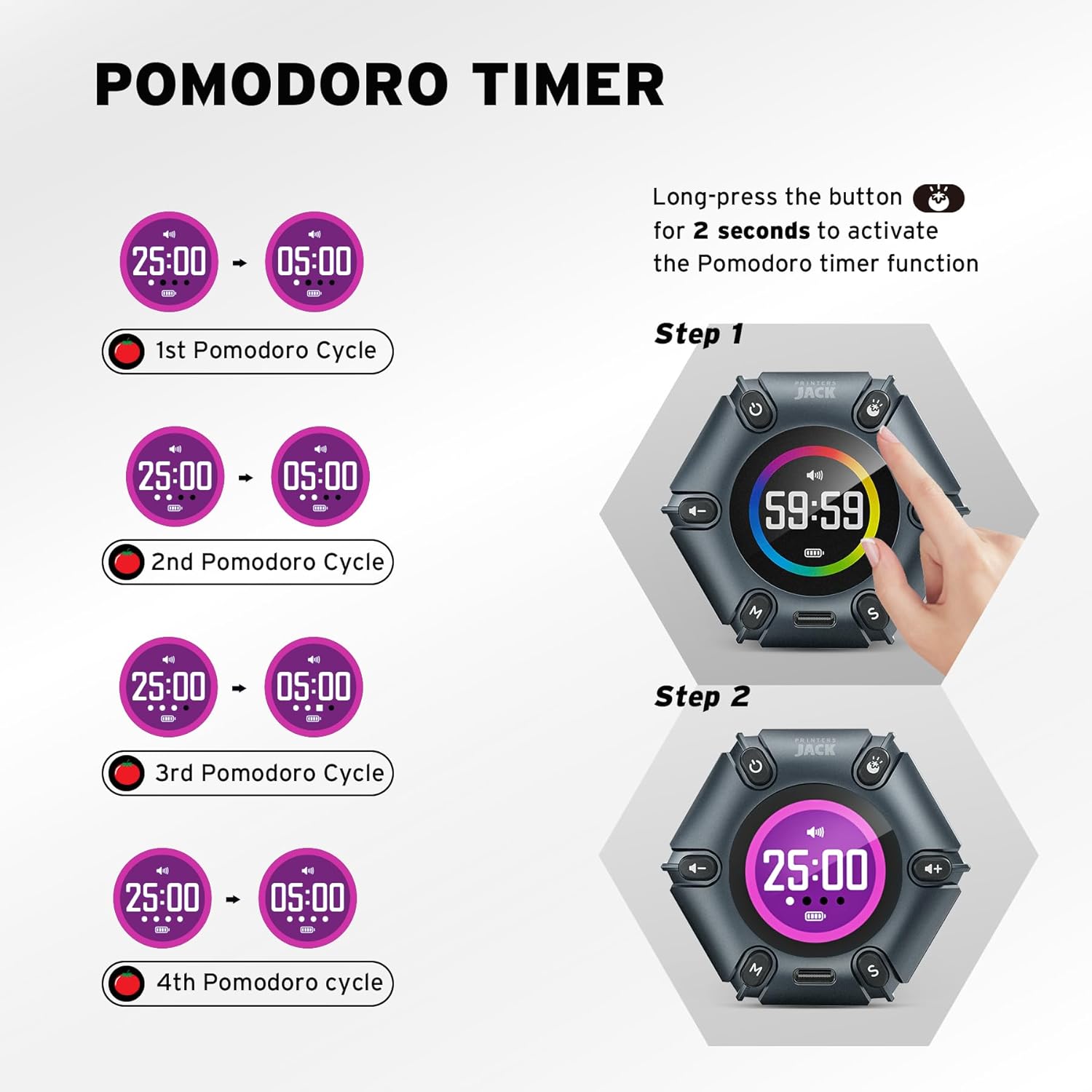 - Unique design: The Printersjack pomodoro timer is designed to make your life more efficient and relaxing. It features six preset countdown times—3, 5, 10, 25, 30, and 60 minutes—that are activated with a simple flip. Additionally, you can customize the countdown using the M and S buttons below, which allow you to increase the time. This clock helps you manage your time effectively and take control of your day.