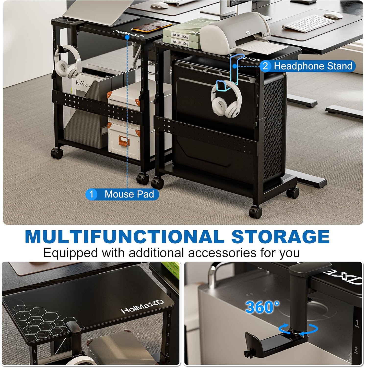 Height Adjustable Computer Tower Stand, 2-Tier ATX-Case CPU Holder with Mouse Pad & Headphone Stand, Mobile PC Standing Under Desk, Home Office Gaming Accessories, Computer Cart Wheels, Black