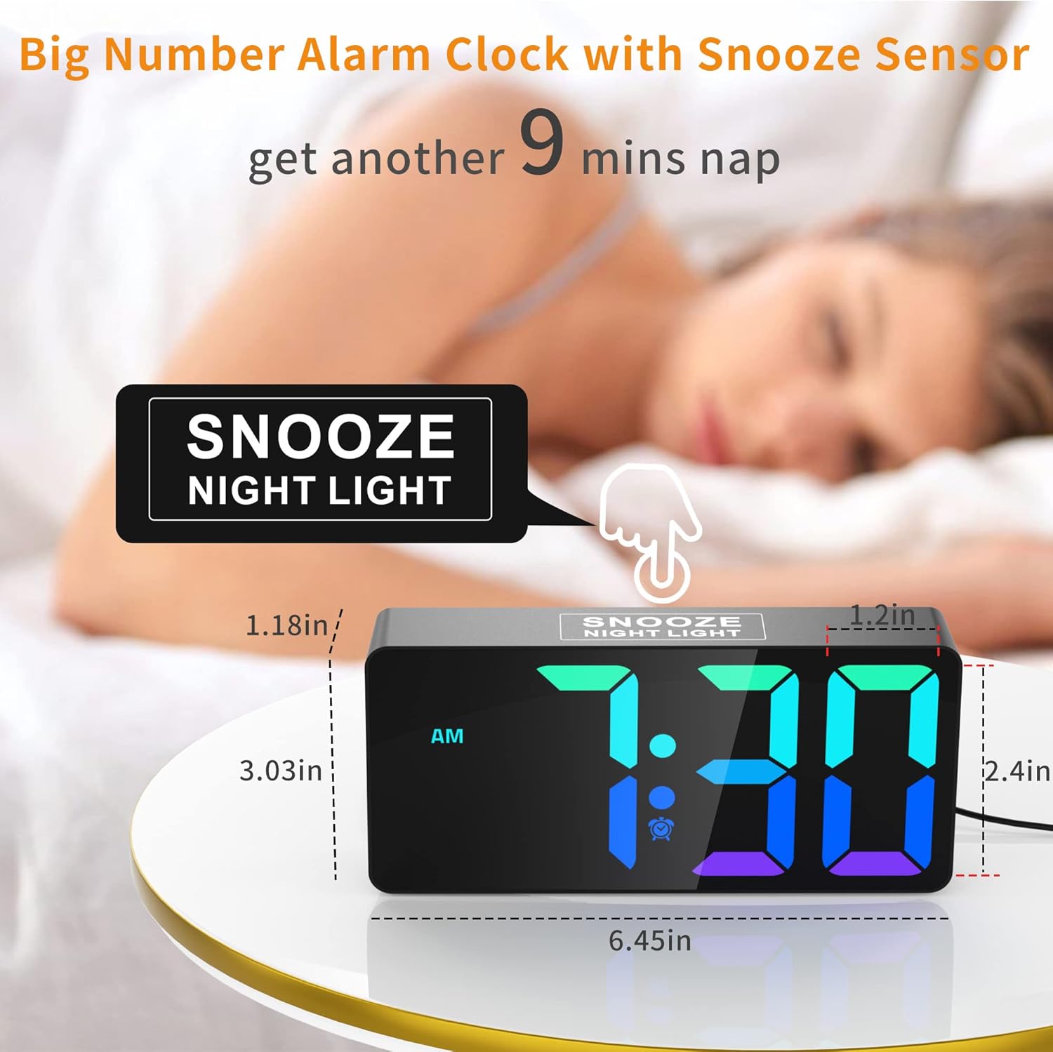 - πγDynamic RGB Alarm Clocks for BedroomsγThe dynamic colorful LED display feature makes this digital clock a unique addition for home living room decor. With the ability to cycle through multiple colors and change in real-time, it creates an eye-catching visual display that is sure to impress. The color ranges from Random Color-RGB Left to Right Flowing-RGB Top Downward Flowing-White-Red-Green-Blue to RGB Changing. Go and customize your mesmerizing visual experience.