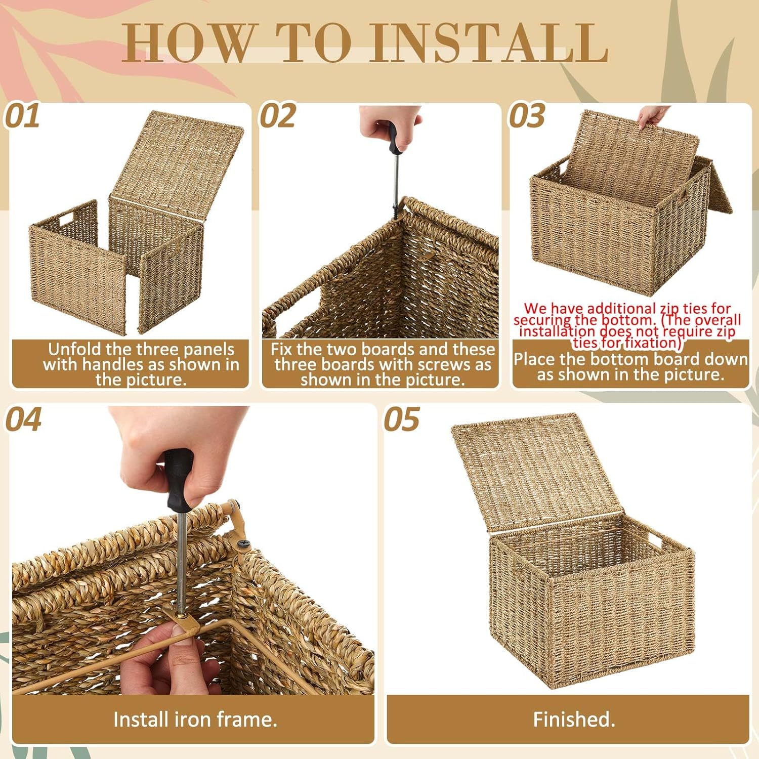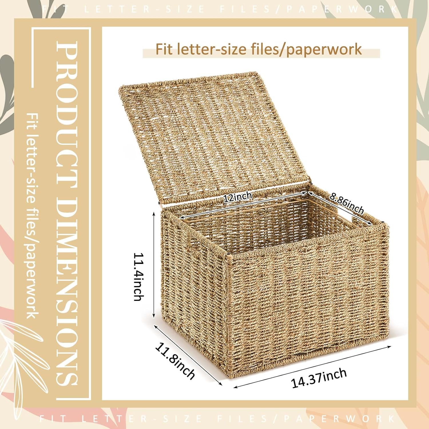 Seagrass File Box Organizers Collapsible Letter/legal Size Filing Cabinet with Lid Portable Decorative Document File Storage Box for Office/decor/home, Natural