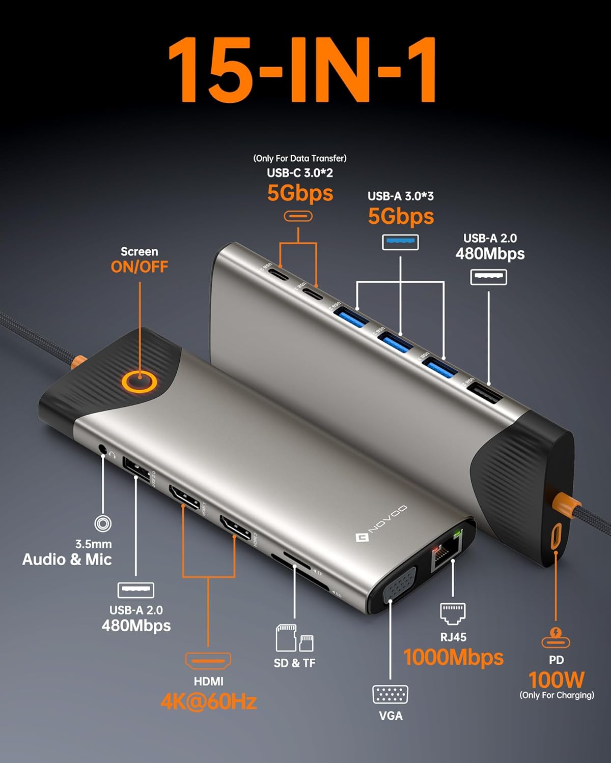 - 15 in 1 USB C Docking Station: NOVOO USB C HDMI Multi-Port hub with Screen Switch, Dual 4K HDMI Ports, 2*USB-C 3.0 Data Ports (Up to 5Gbps), 1*USB C PD100W charging port, 3*USB-A 3.0 Ports, 2*USB-A 2.0 Ports, Gigabit RJ45 Ethernet, VGA, SD/Micro SD Card Reader and 3.5mm Audio/Mic Port. Plug and play for your many needs.