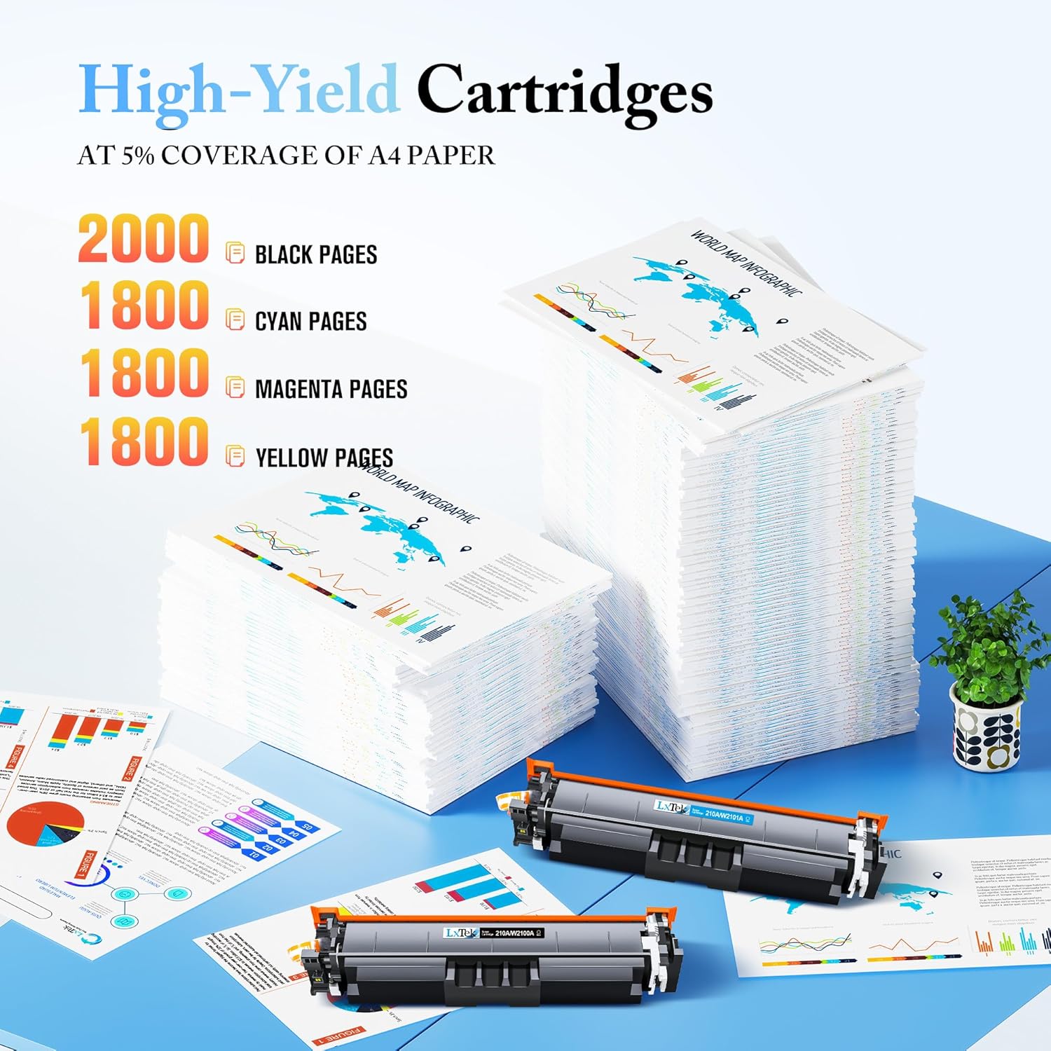 - γHigh Yield 210Aγ: Up to 2,000 Pages for HP 210A W2100A black, 1,800 Pages for 210A W2100A Yellow, 1,800 Pages for 210A W2100A Cyan and 1,800 Pages for 210A W2100A Magenta based on 5% coverage (Letter/A4)