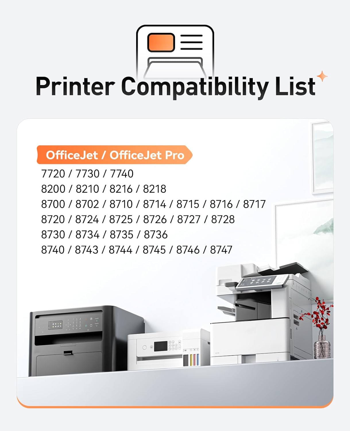 - Compatible Devices : Compatible with HP OfficeJet / OfficeJet Pro 7720 7730 7740 8200 8210 8216 8218 8700 8702 8710 8714 8715 8716 8717 8720 8724 8725 8726 8727 8728 8730 8734 8735 8736 8740 8743 8744 8745 8746 8747 Printers Compatible with HP OfficeJet / OfficeJet Pro 7720 7730 7740 8200 8210 8216 8218 8700 8702 8710 8714 8715 8716 8717 8720 8724 8725 8726 8727 8728 8730 8734 8735 8736 8740 8743 8744 8745 8746 8747 Printers