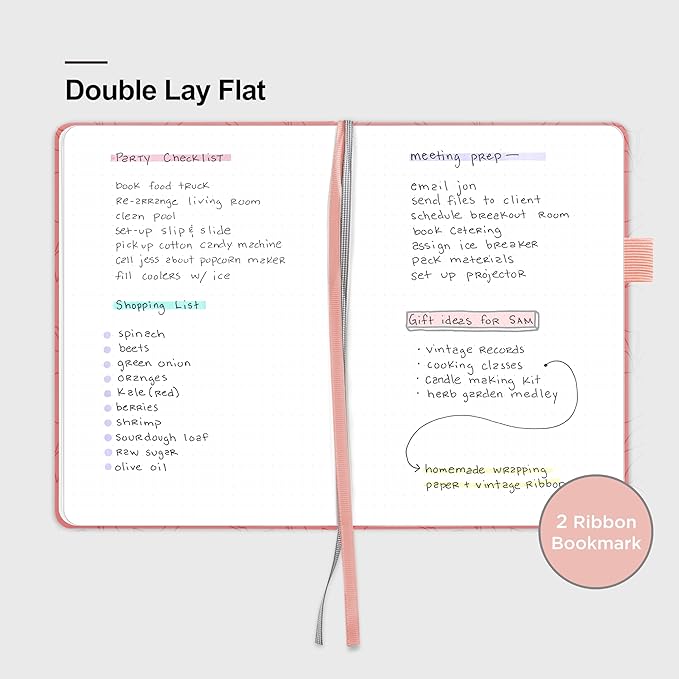 - 180Β° LAY-FLAT DESIGN: The lay-flat design allows for easy writing and ensures that you can utilize every page efficiently. Journaling, note-taking and planning has never been easier! 2 Bookmarks to help you find important content faster