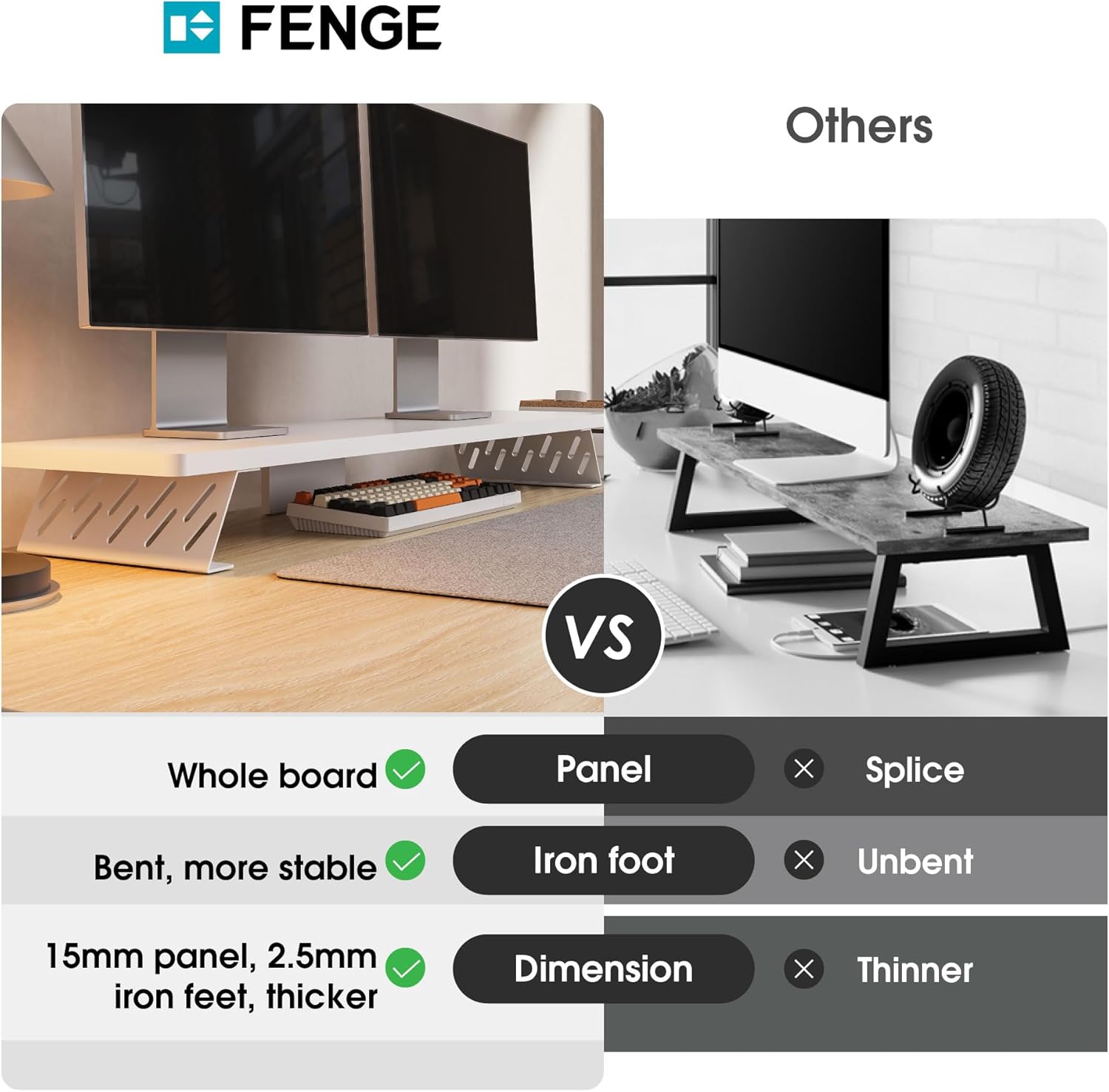 - 【Monitor Stand for Desk】To ensure fenge monitor stand can be used permanently, we have adopted high-quality thickened panels and metal legs. With heavy-duty steel base, so you don't have to worry about collapse or shaking during use. Each desk leg is equipped with a non-slip pad to prevent the table from being scratched. The maximum load-bearing of the monitor riser can reach 66 pounds.