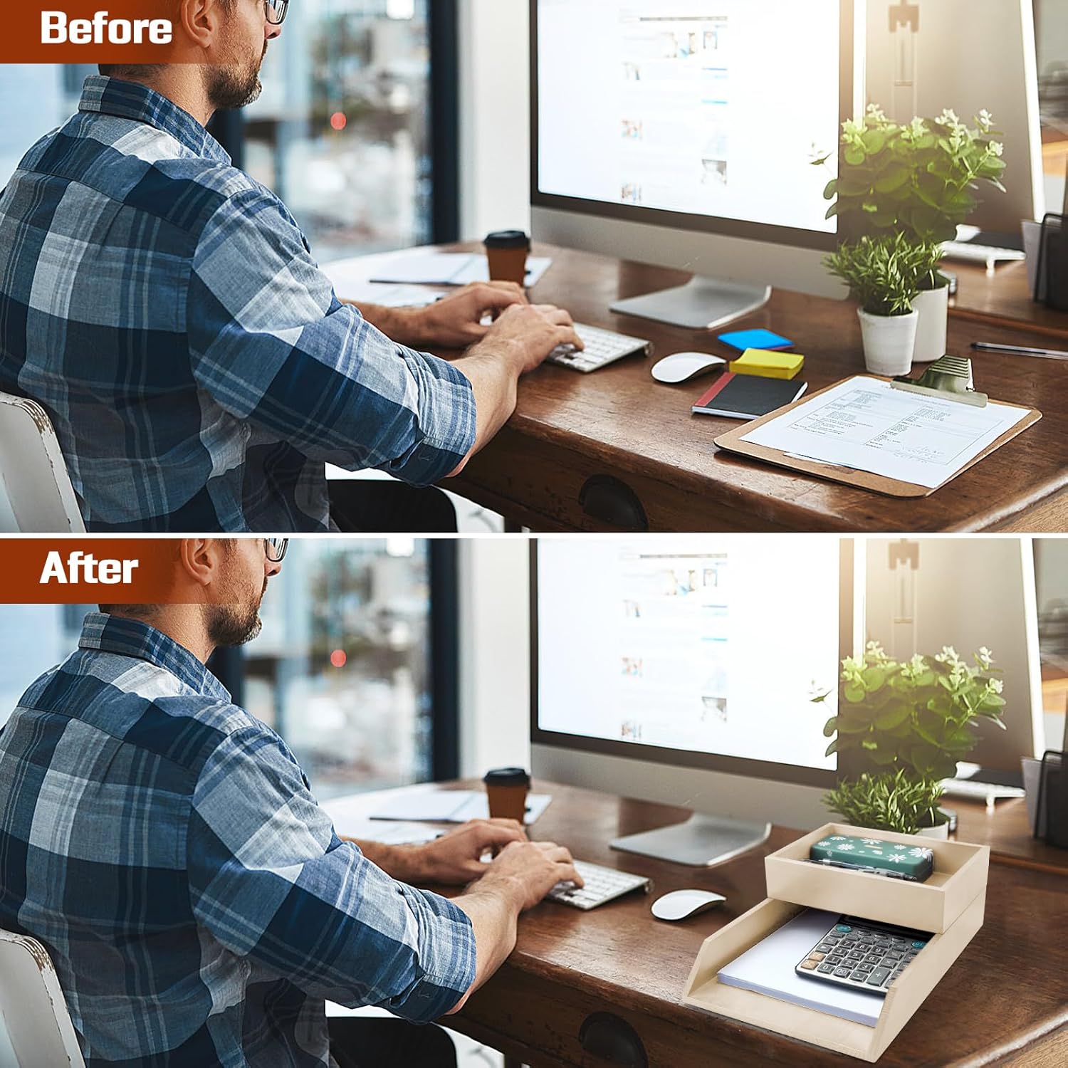 - Suitable Size: The size of the lower layer is 13*9.4*2.36 inch, and the larger space can meet the storage needs of various items. The upper layer is 9.4*6.7*2.1 inch in size, which is suitable for placing small stationery. Such a size design will not take up too much space whether it is placed on a large office desk or a small home work area, and it can also effectively classify and store items.