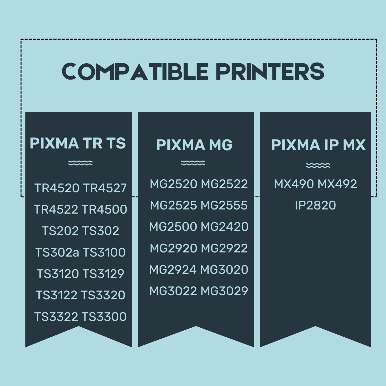 - Compatible printers: with PIXMA TR4520, TR4527, TR4522, TR4500, MX490, MX492, IP2820, MG2520, MG2522, MG2525, MG2555, MG2500, MG2420, MG2920, MG2922, MG2924, MG3020, MG3022, MG3029, TS202, TS302, TS302a, TS3100, TS3120, TS3129, TS3122, TS3320, TS3322, TS3300.