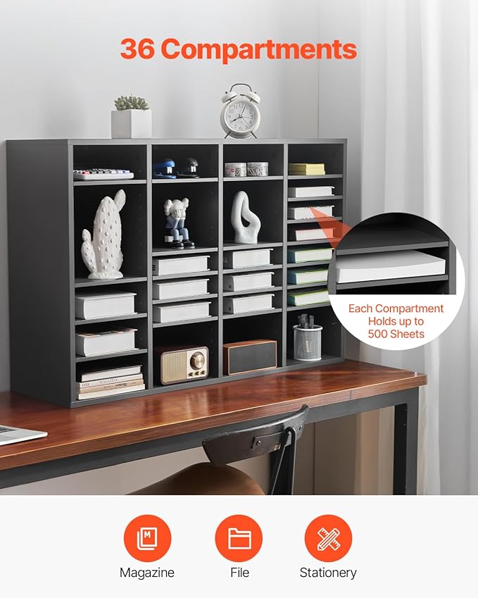 VEVOR Literature Organizer, 36 Compartments Office Mailbox with Adjustable Shelves, Wooden Mailbox Sorter Medium Density Fiberboard Office Home Classroom Storage for Files, Documents, Papers, Grey