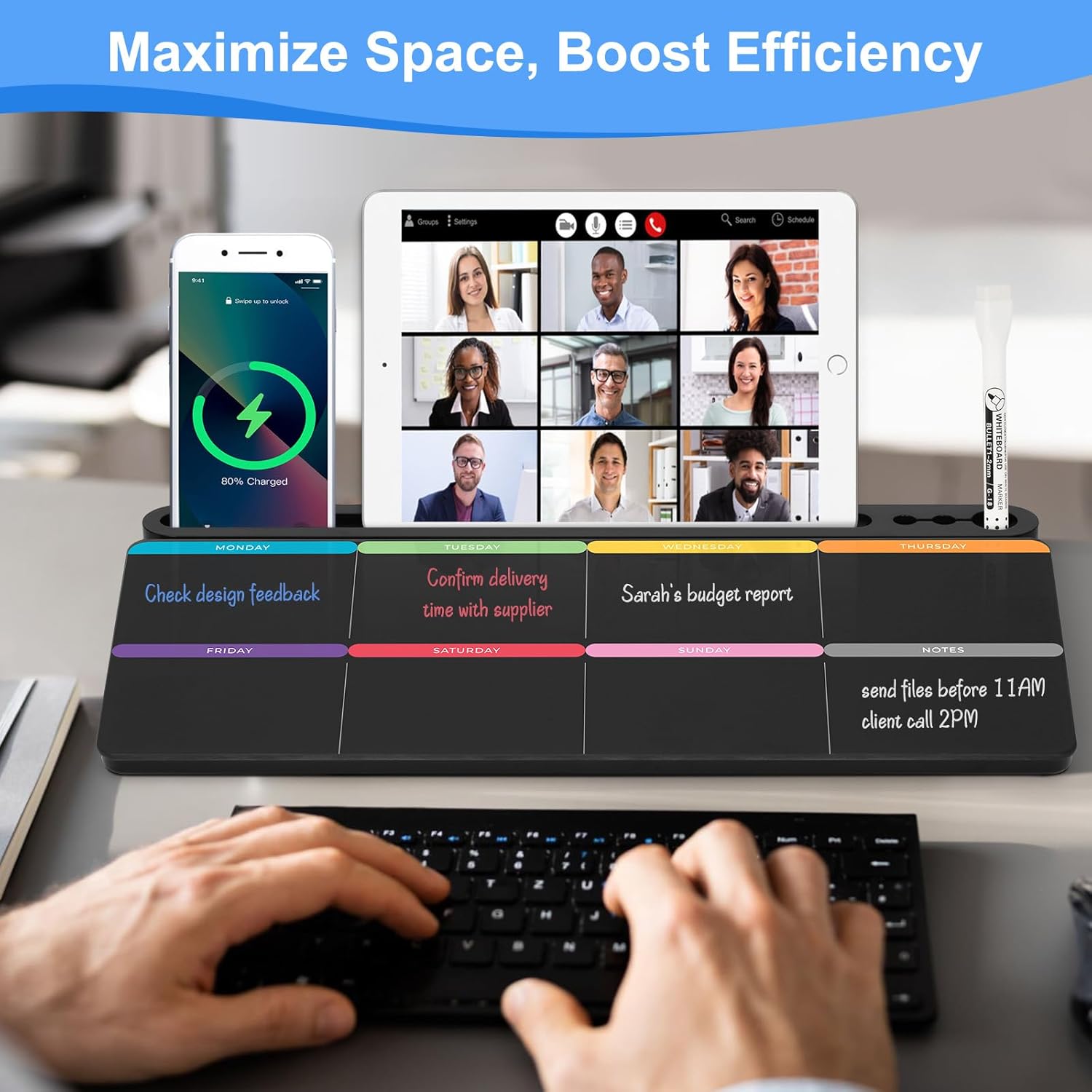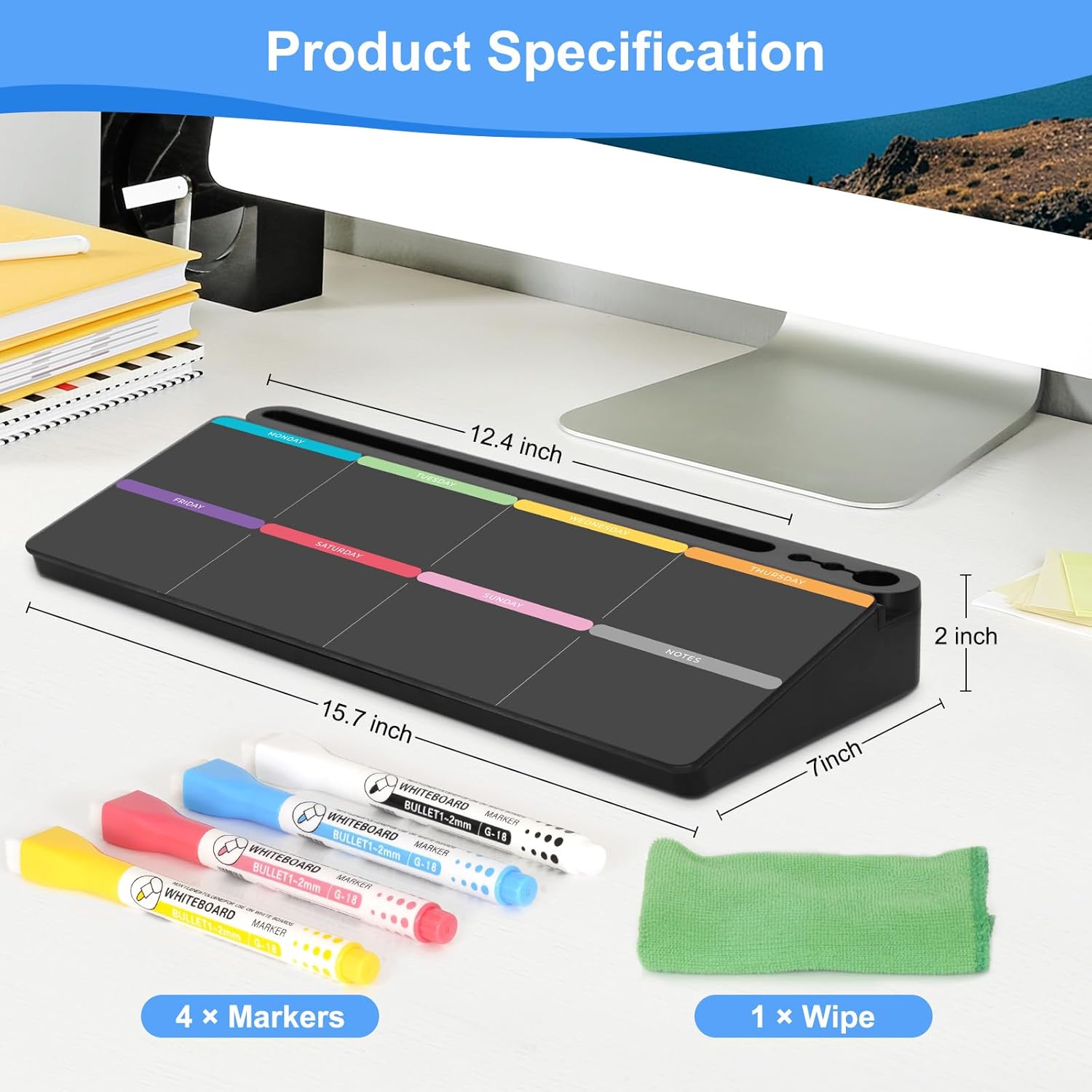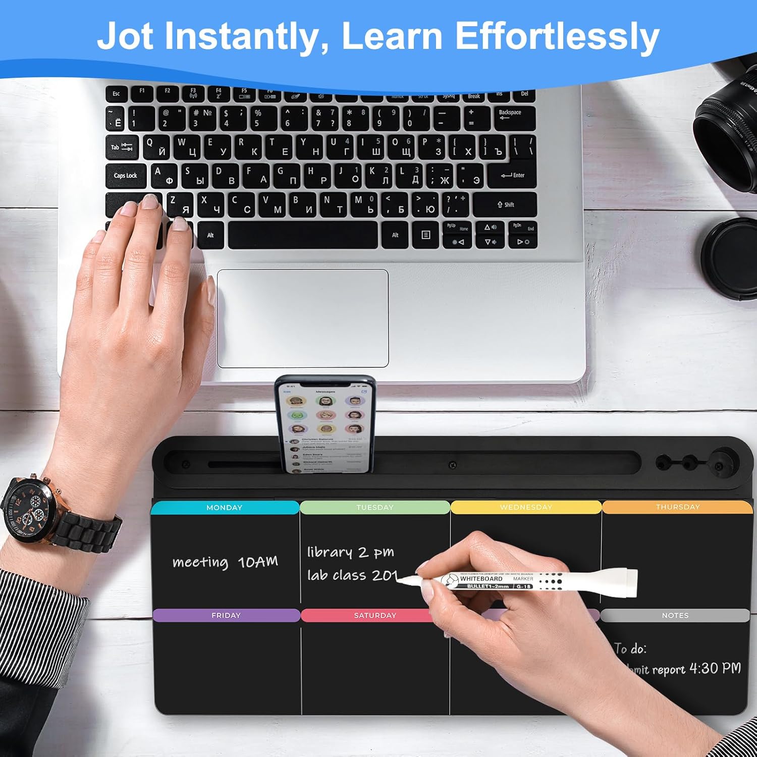 - Weekly Planner Whiteboard - Stay on top of your weekly schedule with ease using our desktop whiteboard. It features a colorful weekly grid with clearly defined sections for each day and notes. Crafted from tempered glass, it offers a smooth writing experience and effortless clean-upβno stains, no scratches. Perfect for organizing tasks, writing to-do lists, and taking quick reminders.