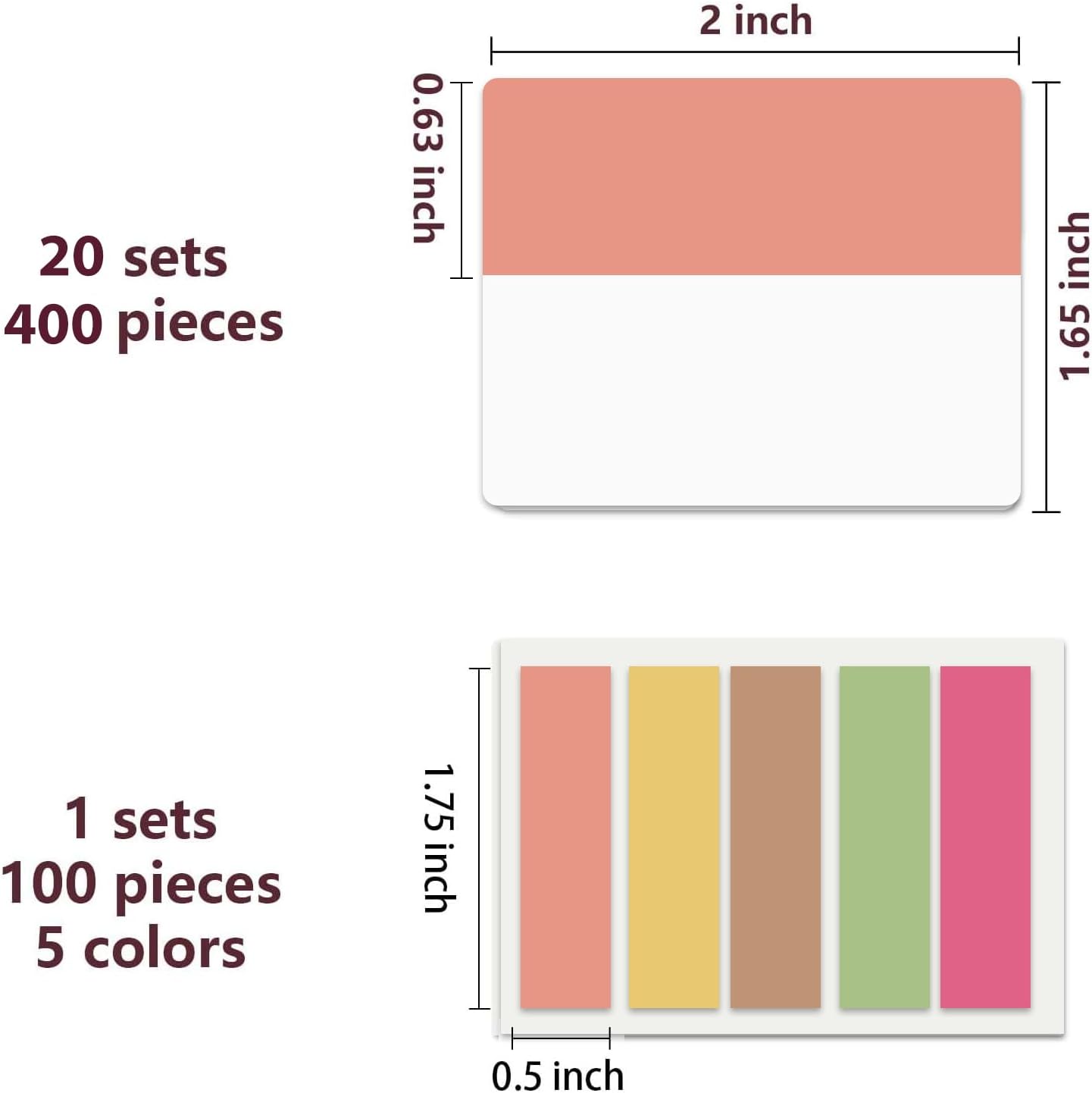 - 500 pieces Book Tabs: 500 pieces 21 sets in total, 400 pieces 2 inch sticky tabs in 20 sets with 10 different pastle colors,100 pieces 0.5 in tabs in 1sets, 20 pieces each color