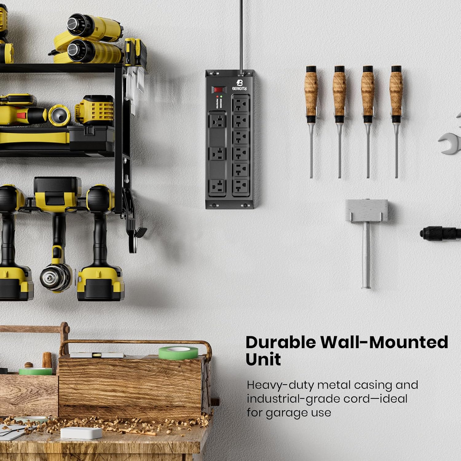 - Wall Mount Heavy Duty Metal Power Strip: Durable Metal Casing with 2 Mounting Holes, Easy to Install on Desktops, Under Tables, Workbenches, or Walls, Suitable for Vertical and Horizontal Setups in Garages, Workshops, and Offices
