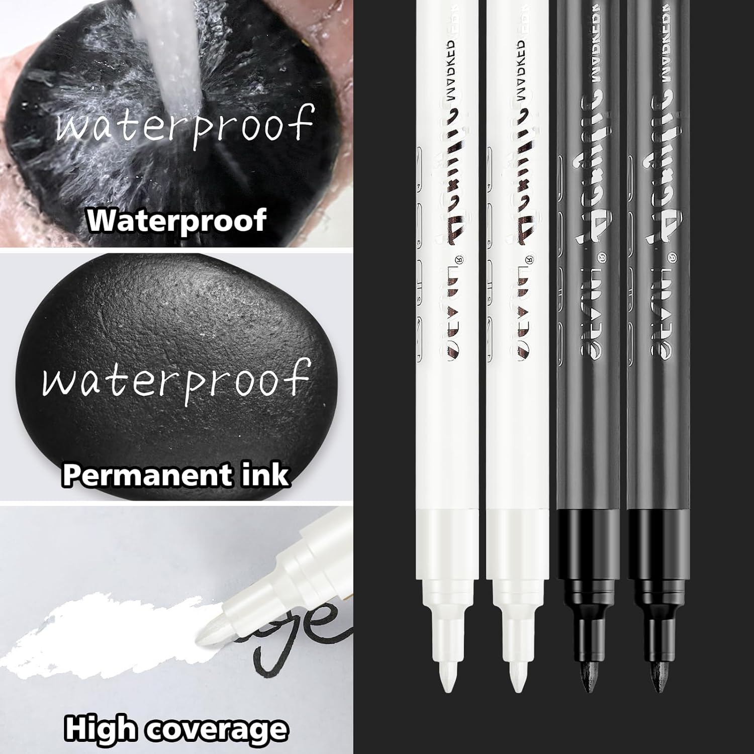 SFAIH White & Black Paint Markers Pens - 4 Pack 0.7MM Fine Tip Acrylic Markers for Rock Painting, Wood, Metal, Fabric, Plastic, Canvas, Glass, Ceramic, Diy Crafts, Drawing, Tire
