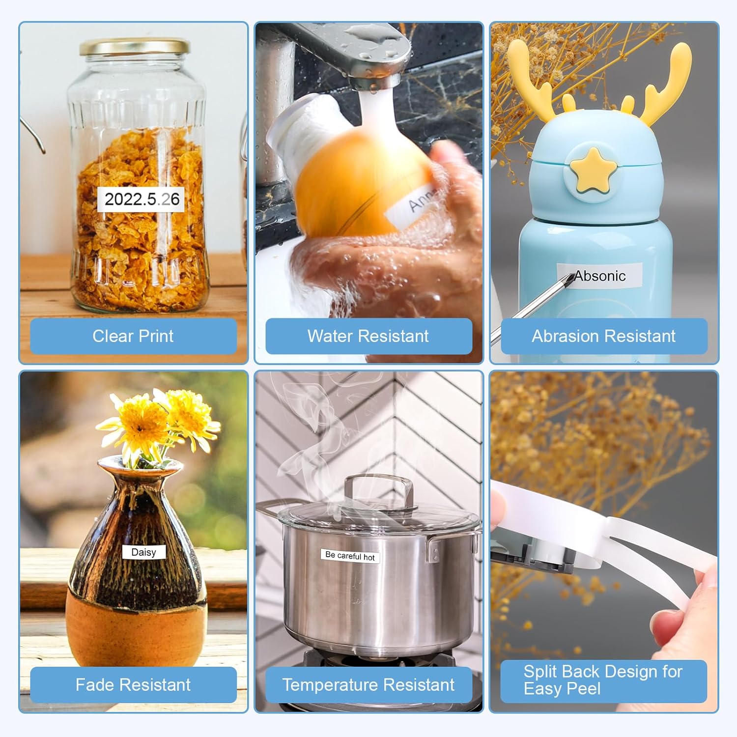 - Features: 12mm black on white label tape compatible with Brother P Touch label tape tz tze 12mm 0.47 inch white tape is waterproof, abrasion resistant, fade resistant, and temperature resistant. The split-back design for easy peel