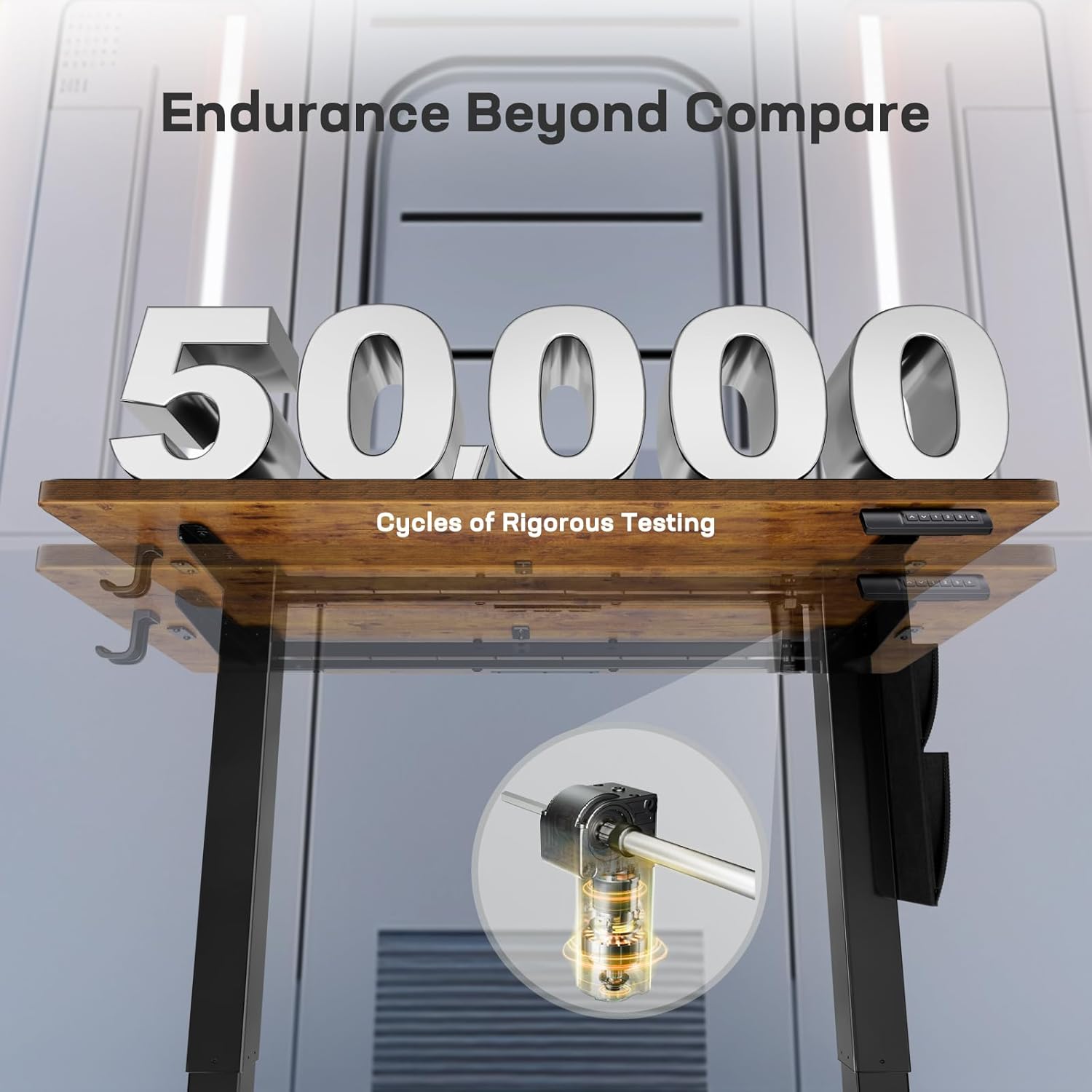 - Energy-Efficient Motor: Powered by a quiet motor operating at less than 50 dB, the desk moves smoothly at 1 inch per second even at maximum load. Its solid steel frame ensures stability, providing a reliable foundation. The energy-efficient motor consumes less power, making it eco-friendly. Designed for daily use, the motor supports a dynamic work environment, transitioning seamlessly between tasks. The frame enhances durability, remaining stable regardless of load or adjustments.