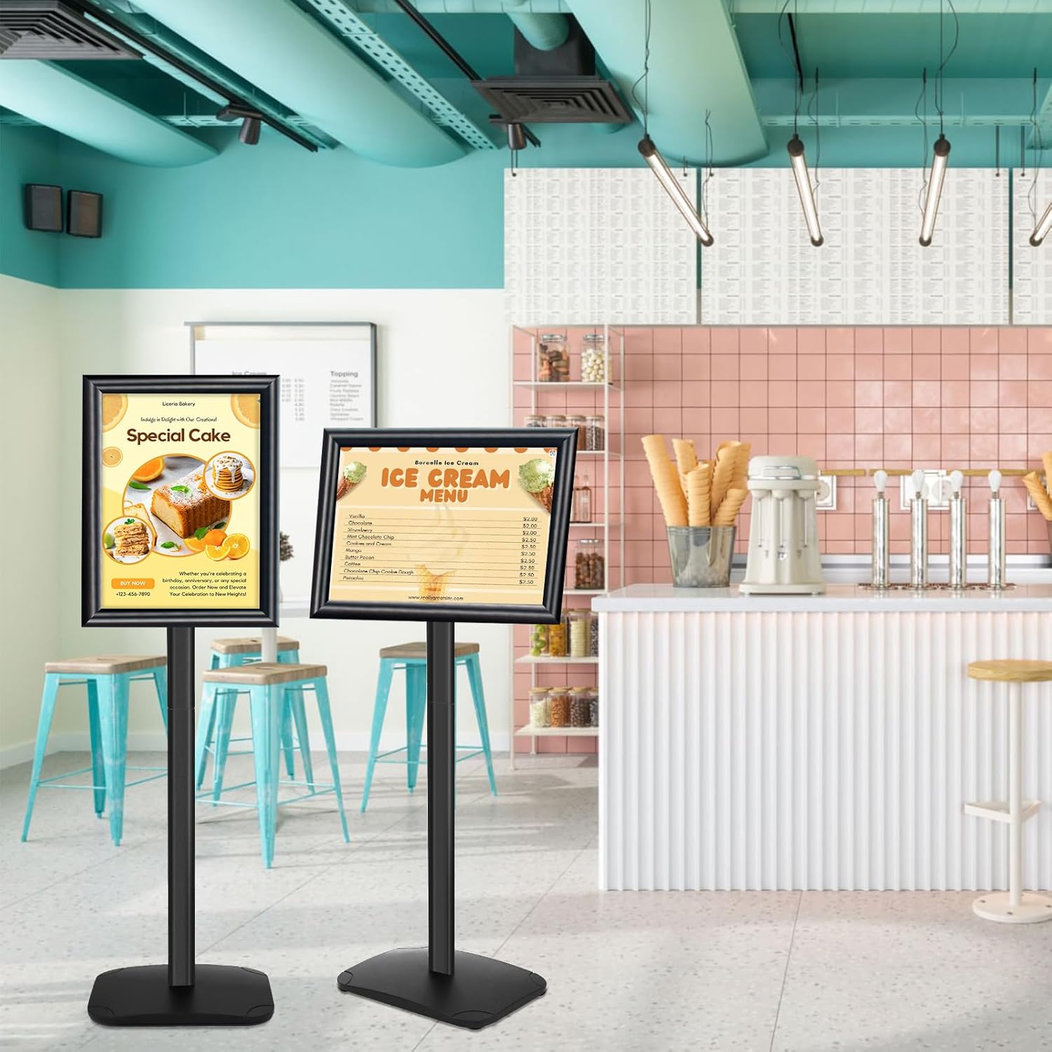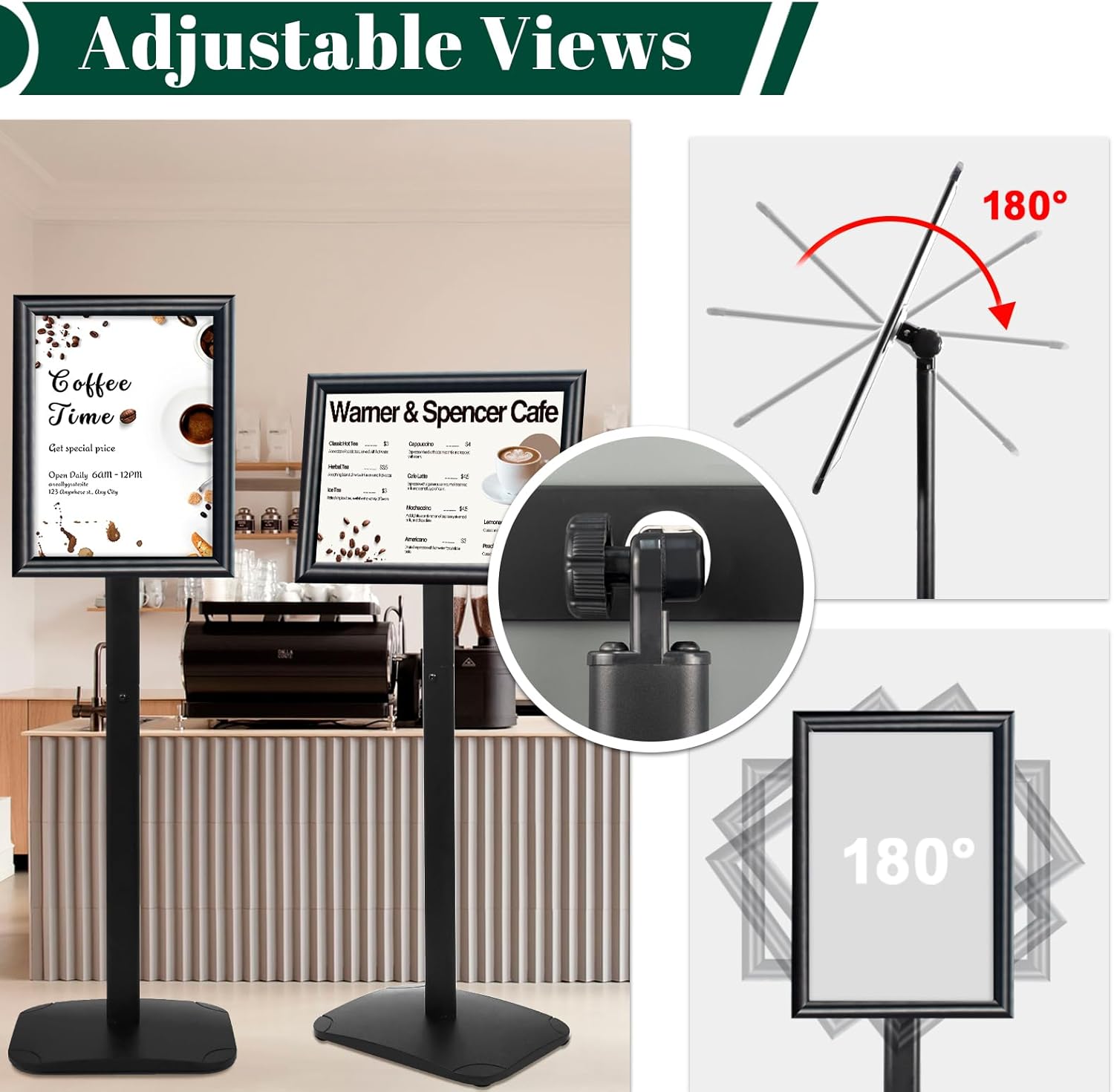 - ✅【180° & 360° Adjustable Views】Our sign stand offers complete flexibility with 180° and 360° adjustable views, allowing you to showcase your posters from any angle.