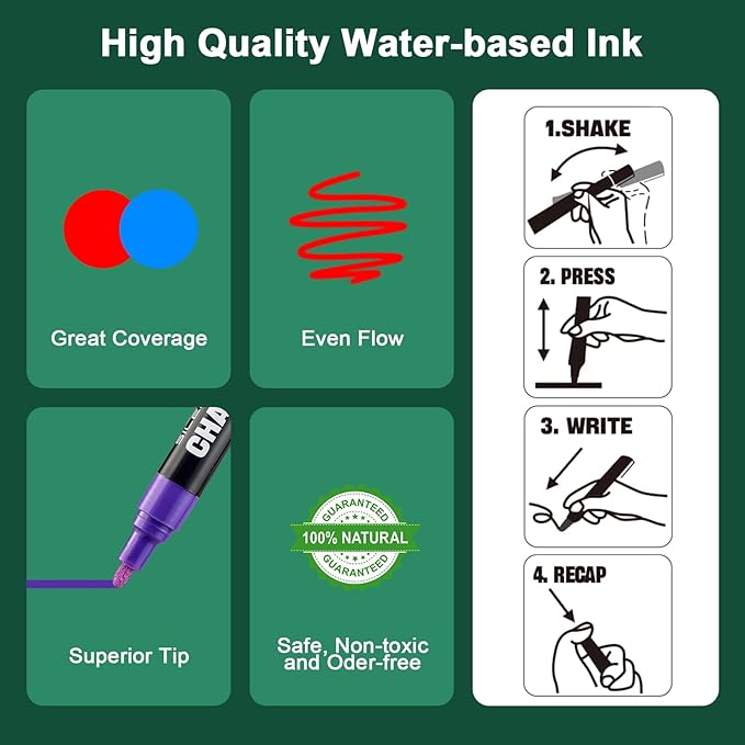 - High Quality. The chalkboard markers come with more volume of ink, nontoxic, odorless, and dust-free, made of premium quality, last in a long time.