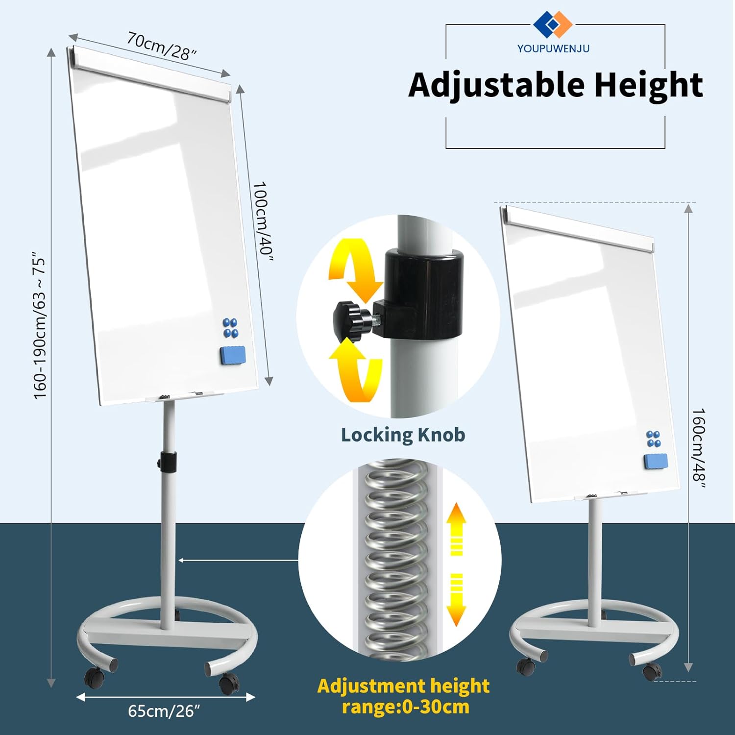 Rolling Whiteboard Magnetic Writeboard 40"x28" Flip Chart with 5 Wheels Adjustable Height Multi-Use Standing Bulletin Board (White)