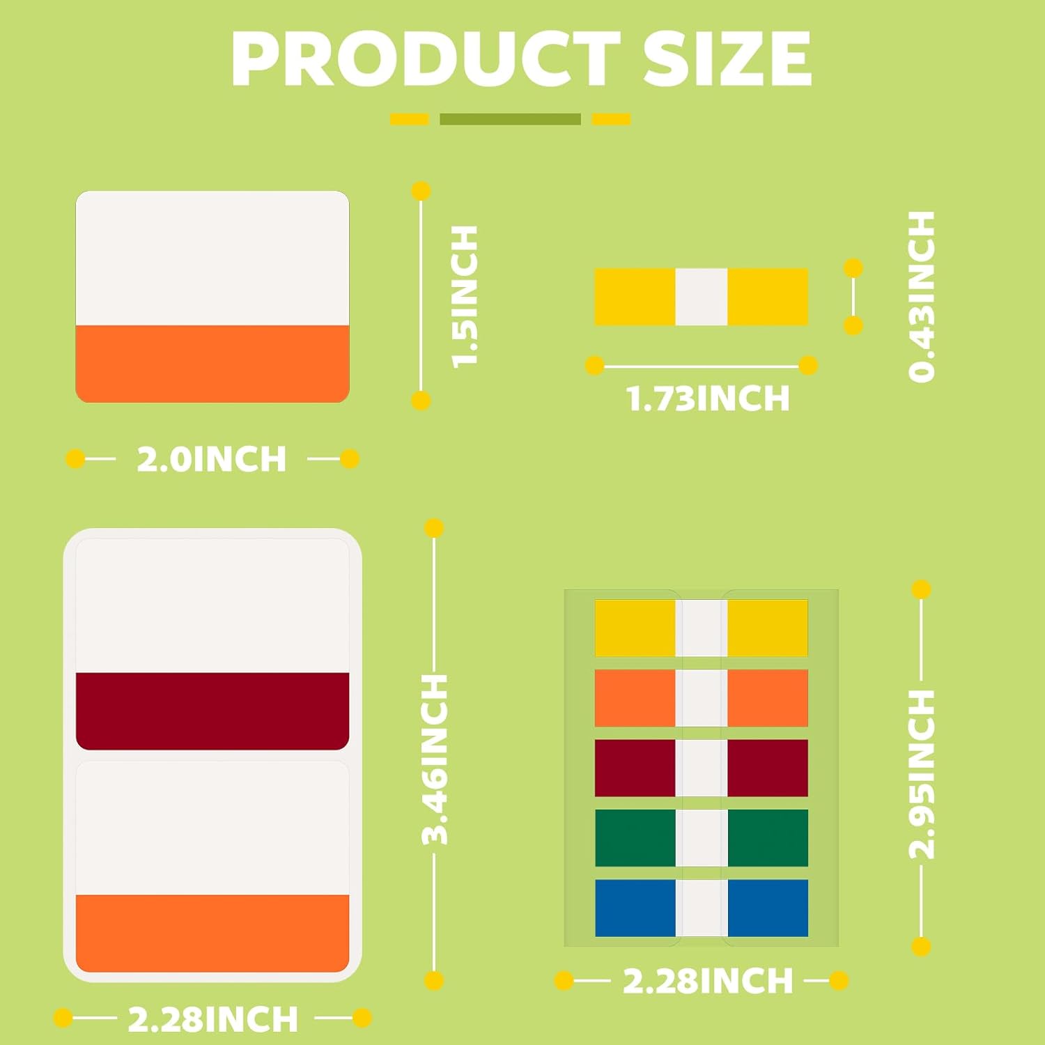 - Package includes: 600 pieces 22 sets in total, 400 pieces 2'' sticky tabs in 20 sets with 10 different neon colors, 200 pieces 0.5inch tabs in 2sets, 20 pieces each color and color as picture displayed.