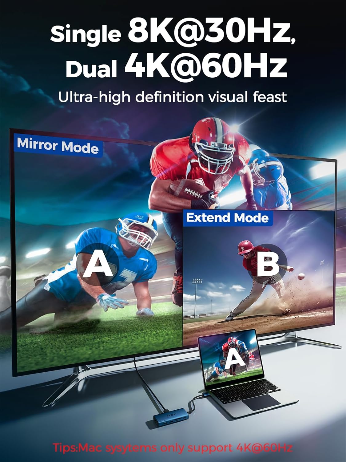- γDual Display Ultra HD OutputγThe docking station dual hdmi supports single 8K, dual 4K@60Hz mirror/extend modes. Ideal USB C to HDMI adapter for MacBook/Windows laptops. Ultra clear images bring you a visual feast!(Note:1γHDMI1 8K requires DP1.4 protocol PC support (Mac systems only support 4K ). 2γFor MAC, the display on both external monitors will be identical.)