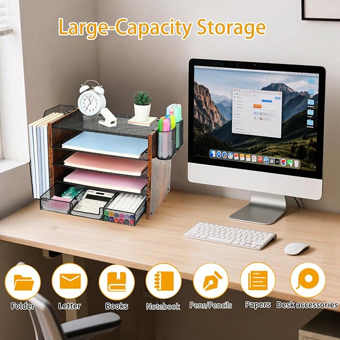- 【Modern Decor Upgrade】Warm brown wood and matte black steel blend perfectly to create clean, flowing lines. This 5-tier paper tray organizer can enhance your workspace, making work more enjoyable, and is also an ideal gift
