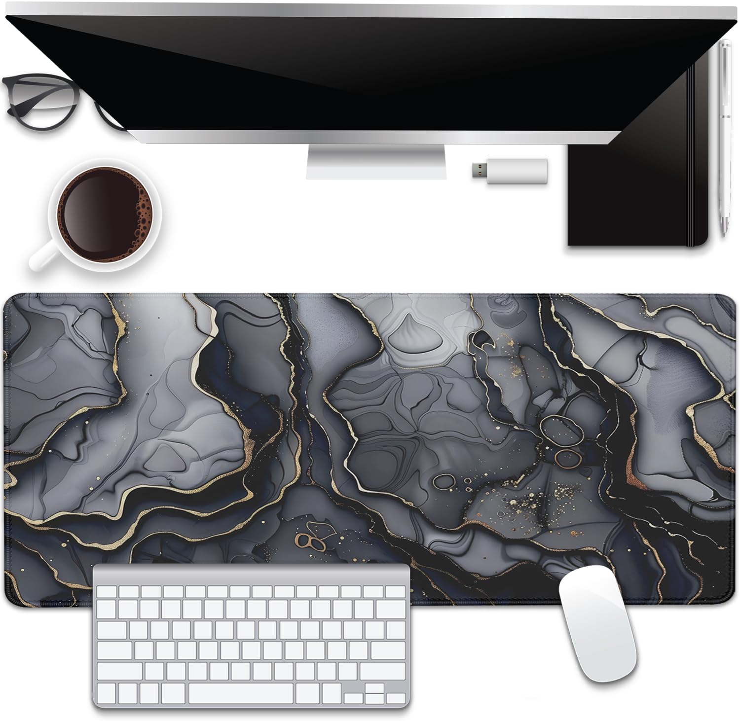 Dark Marble Desk Pad Mouse Pad,Large XL Retro Mouse Mat with Stitched Edges,Non-Slip Rubber Base Mousepad for Office PC Keyboard Laptop and Home Work Desk Mat(27.5X11.8 in)
