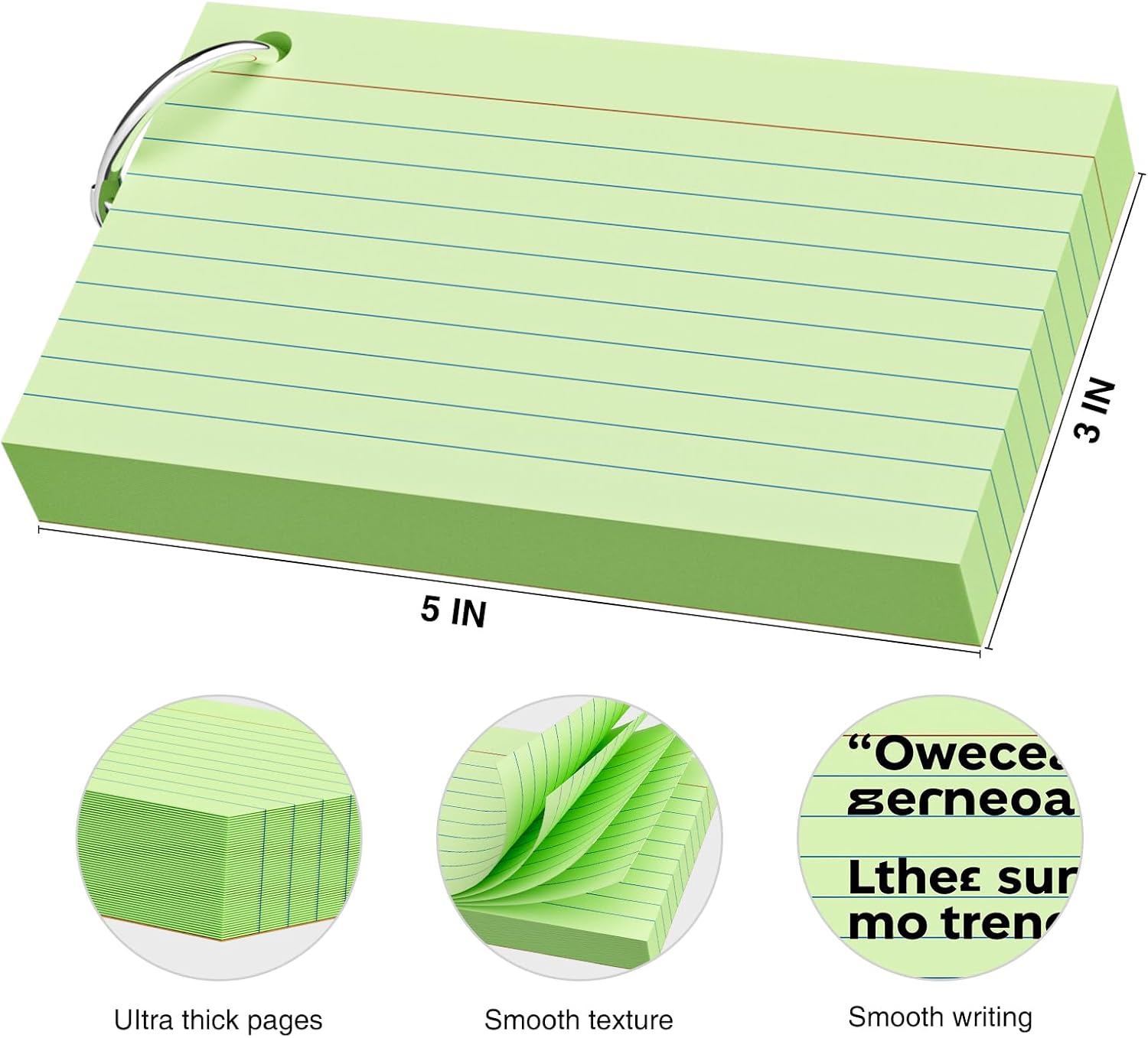250 Count Green Index Cards 3x5 Inch with Key Ring, Color Flash Index Card (50 Sheets Each), Durable & Portable Note Taking for Students, Teachers, Study Note Cards for Office Home School