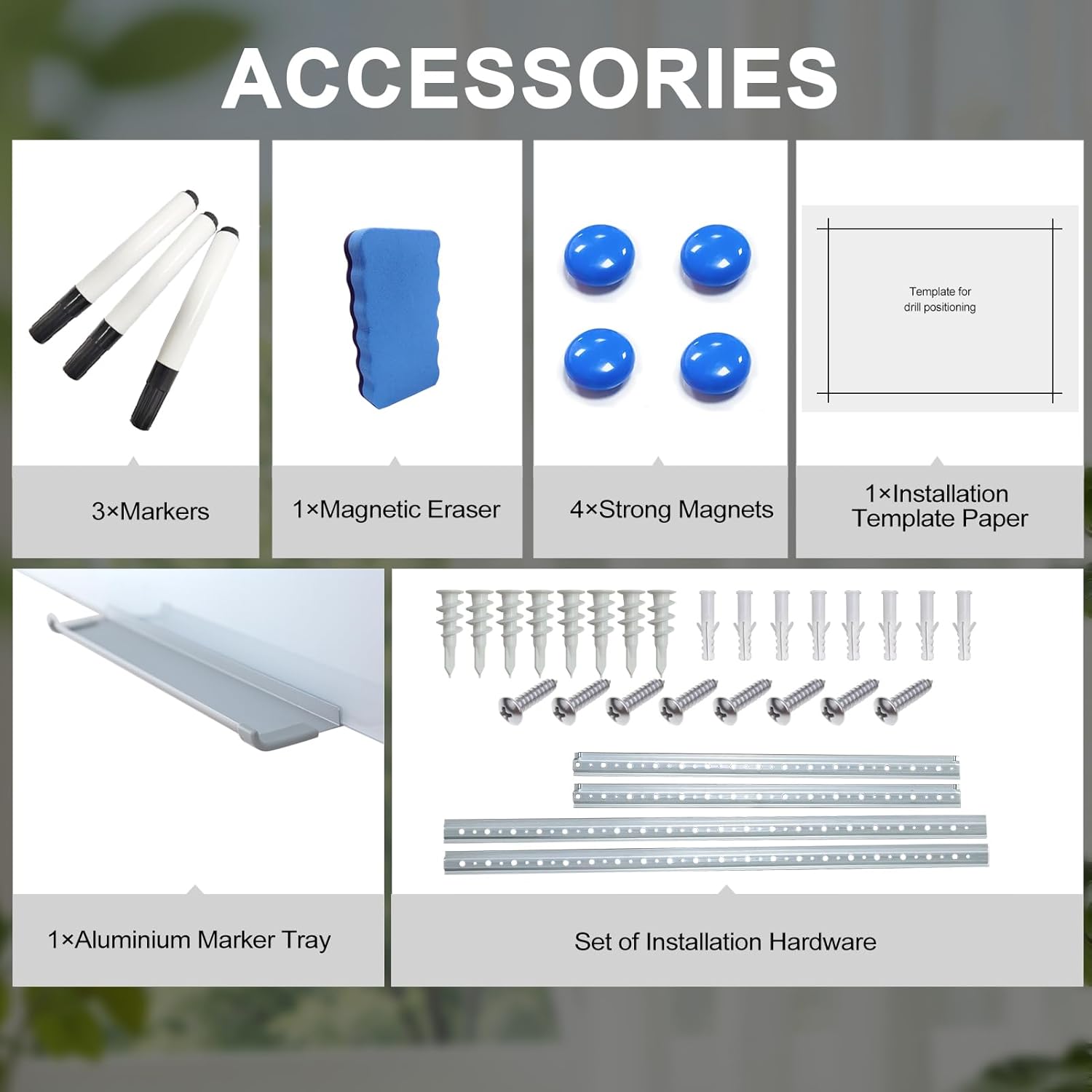 - ACCESSORIES INCLUDED β Measures 48" x 36". Comes with removable accessory tray, 1 Magntic Wraser,2 markers and 2 high power glass board magnets.