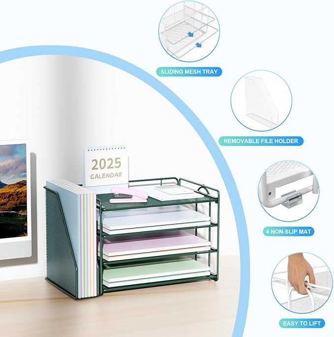 - ▶ Save desktop space: The office desk organizer provides you with 4 paper trays and a vertical file organizer, providing ample space for your desktop and helping to keep your desktop organized and free of clutter.