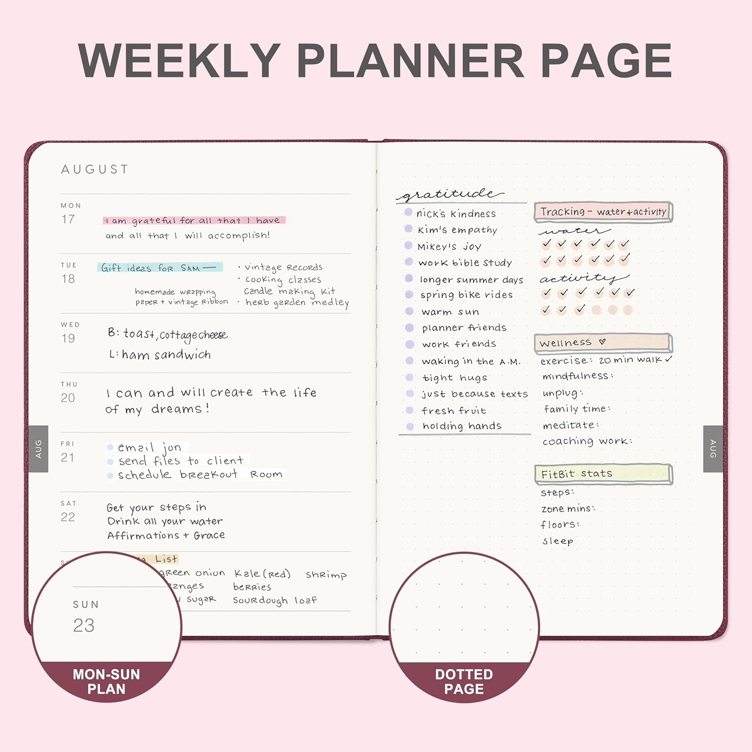- WEEKLY VIEWοΌFrom Monday to Sunday, it provides ample space for line writing, and the dotted page on the right can be used to design and paint, which is easy to manage daily tasks.