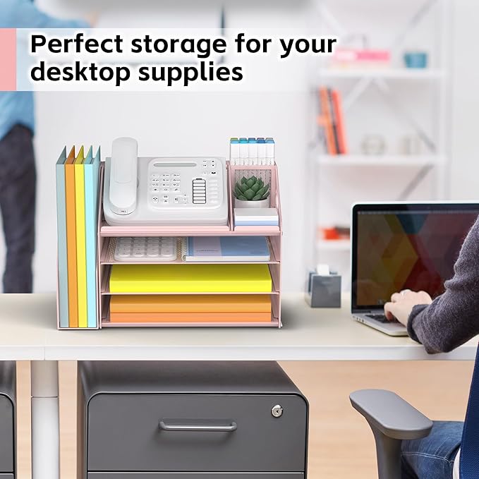 - 4 Tier Organization with Pen Holder: This Pink desk organizer boasts a 4-tier design for efficient sorting of your papers, letters, and other office supplies, along with a dedicated pen holder. It's perfect for maintaining a tidy and uncluttered workspace. The desk file organizer is an essential desk accessory that contributes to an orderly and professional atmosphere