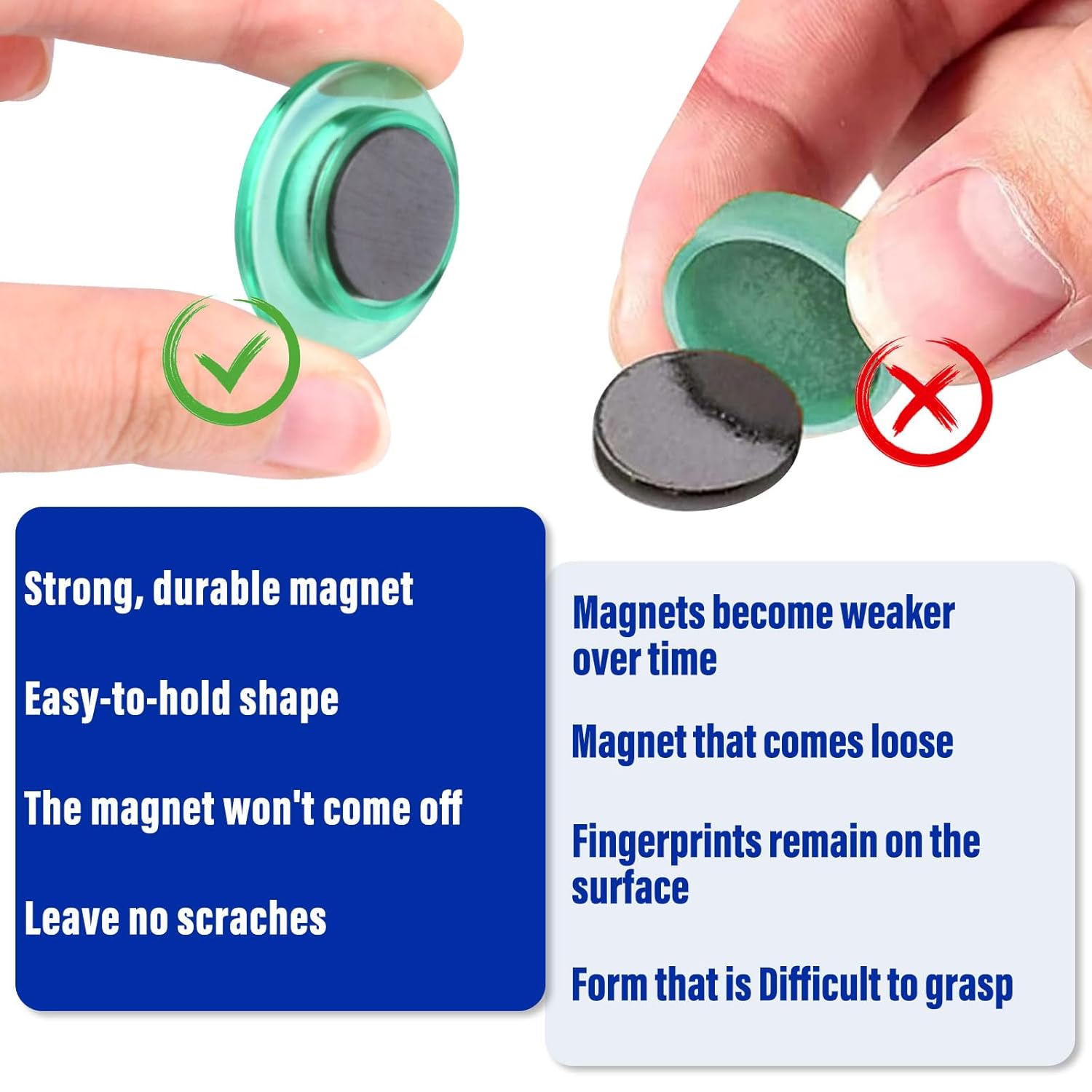 - Durable Magnet: Our strong whiteboard magnets are very durable and can be used for a long time. It has a larger magnetic contact surface that holds better and is more durable than other neodymium magnets. These small magnets are sturdy, cute, stylish and add a pop of color to your decor. Colored magnets can be used on any magnetic surface such as refrigerators, whiteboards, lockers, bulletin boards, etc. If you want to attach heavier items, be sure to use 2+ fridge magnets.