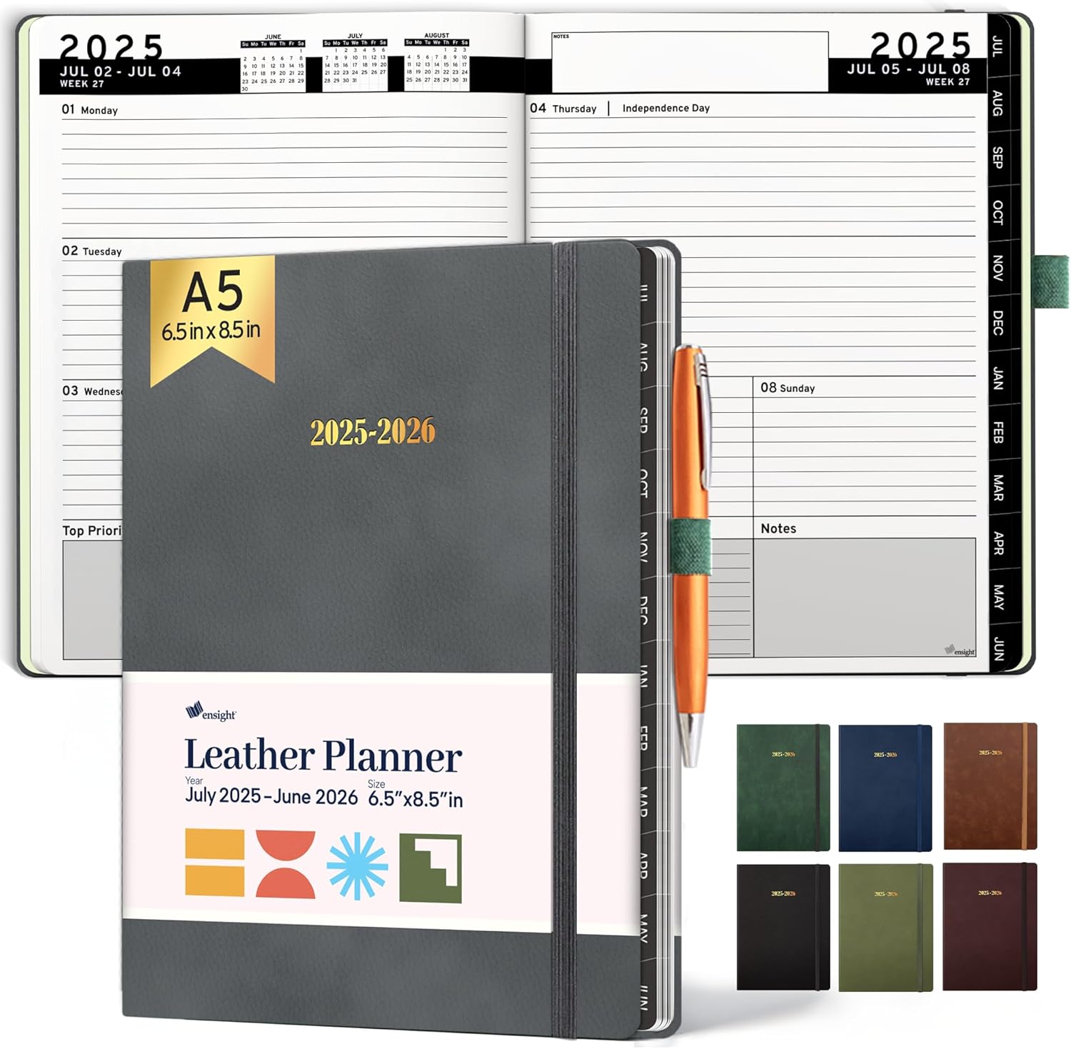 Ensight 2025-2026 HARDCOVER Leather Planner Weekly & Monthly - 6.5x8.5 Inches - Academic Planner Business Personal or Student - Pen Holder, Thick Paper, July 2025 - June 2026 (Grey)