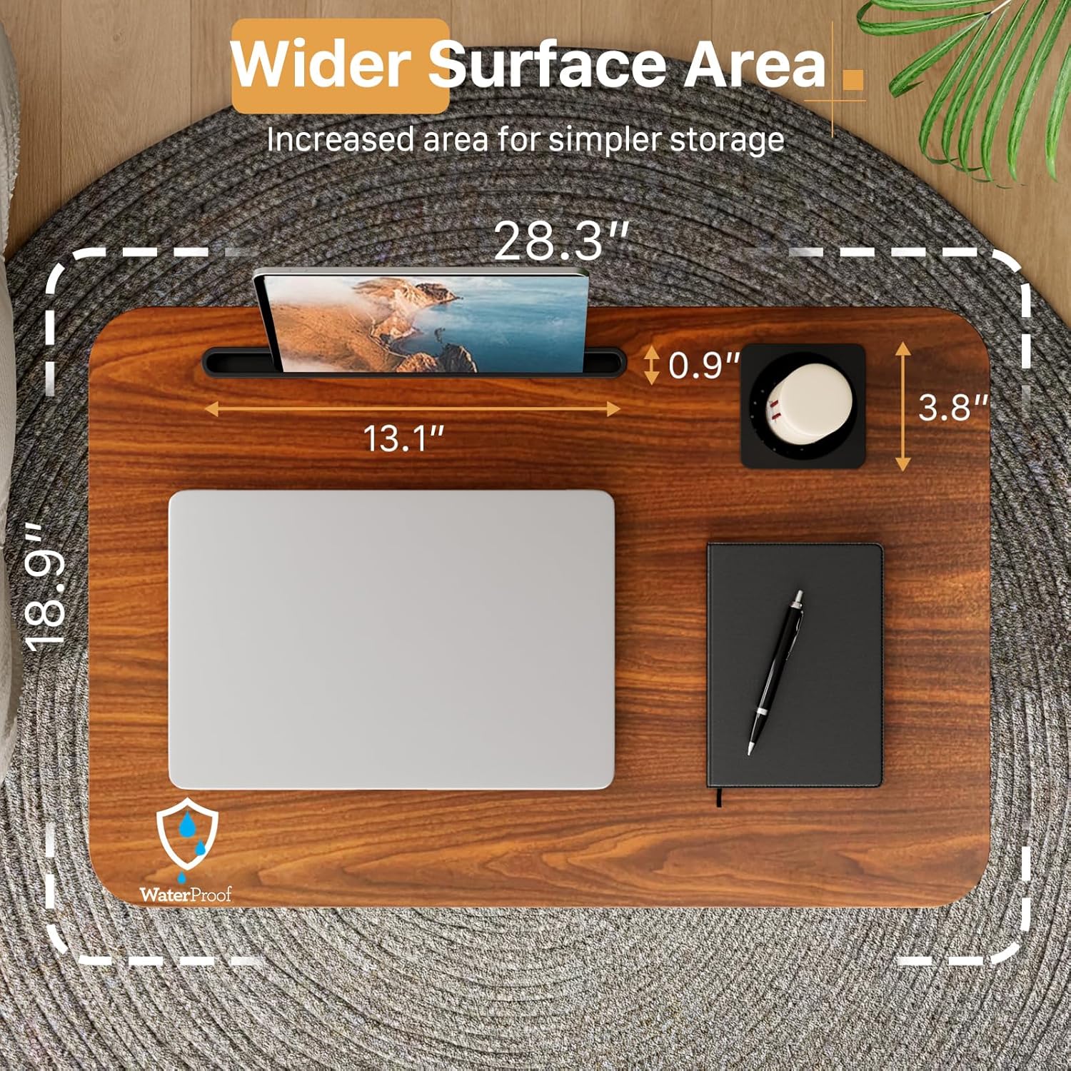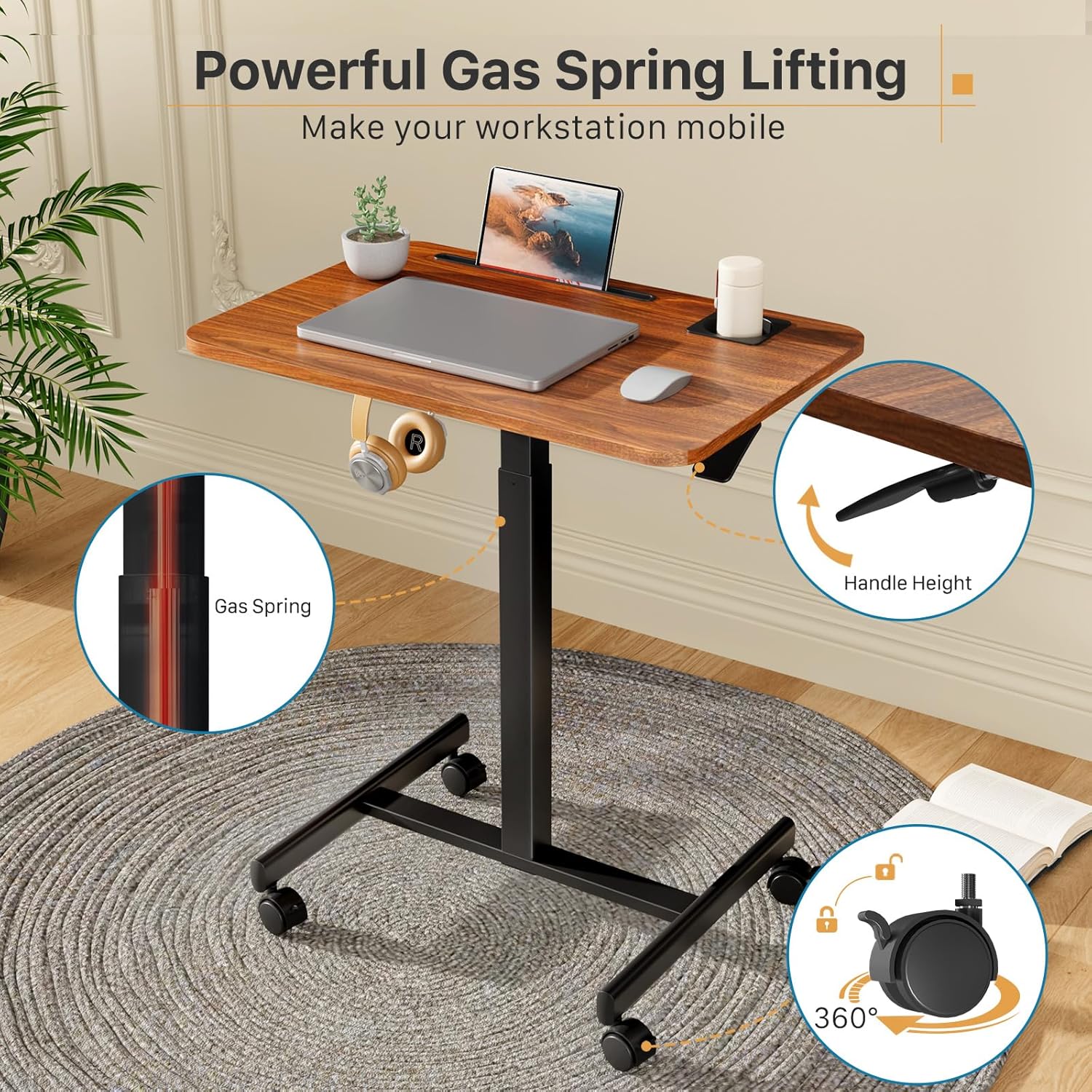 - Multipurpose Mobile Laptop Desk: 28.3''x19'' rolling desk is equipped with cup holder and dedicated slots, it's a good way to contain your drink and office supplies. Meanwhile, Hook design makes it convenient to organize your headset or backpack.