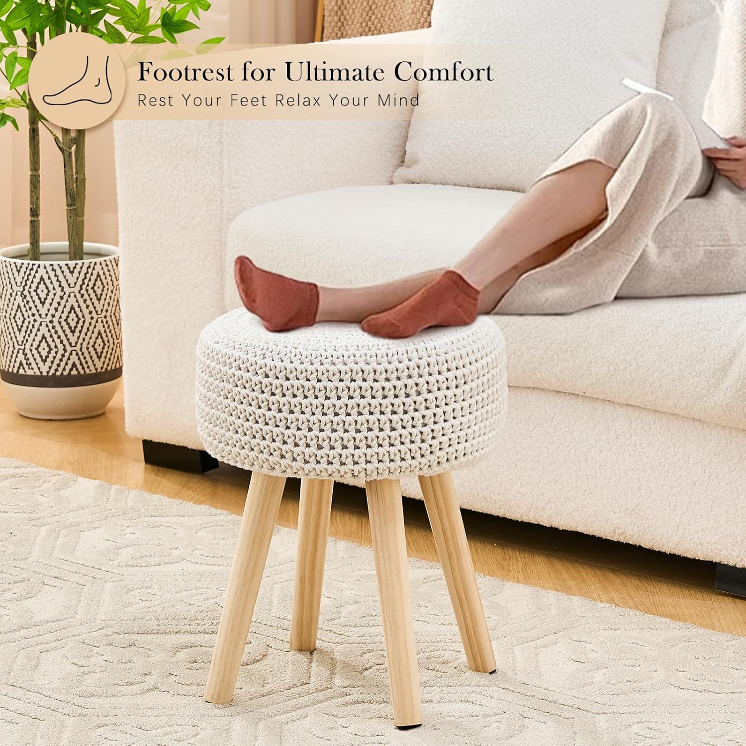 Cotton Knitted Ottoman Round Footstool Vanity Stool Modern Stool Ottoman Footrest Stool with Non-Skid Wood Legs for Living Room Bedroom White