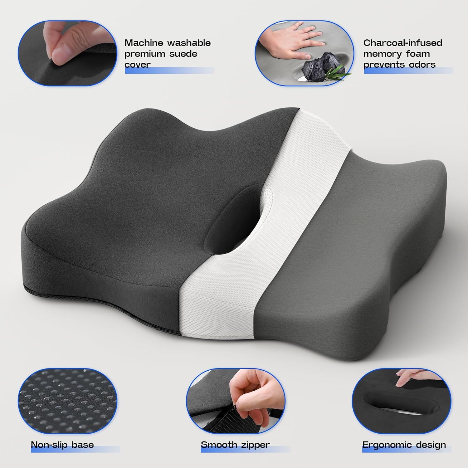 - 【Premium Memory Foam Seat Cushion Materials】Crafted with bamboo charcoal high-density foam, this seat cushion ensures pressure relief, moisture control, and odor resistance. The machine-washable suede cover and non-slip base make it ideal as a car seat cushion for driving or desk chair cushion for long sitting.