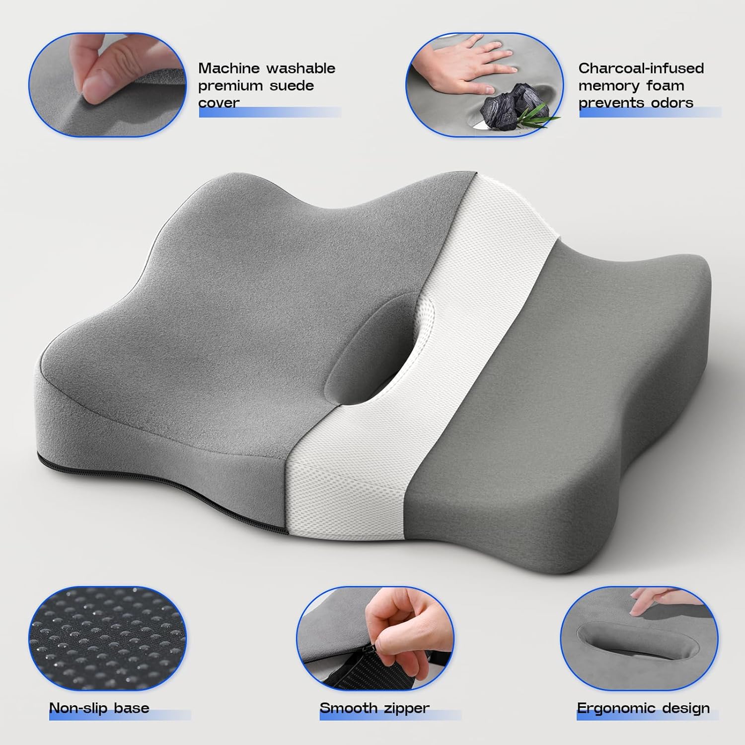 - 【Premium Memory Foam Seat Cushion Materials】Crafted with bamboo charcoal high-density foam, this seat cushion ensures pressure relief, moisture control, and odor resistance. The machine-washable suede cover and non-slip base make it ideal as a car seat cushion for driving or desk chair cushion for long sitting.