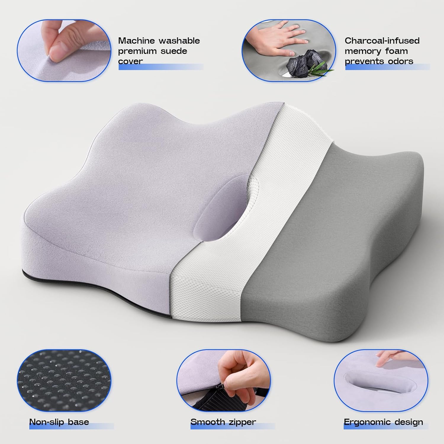 - 【Premium Memory Foam Seat Cushion Materials】Crafted with bamboo charcoal high-density foam, this seat cushion ensures pressure relief, moisture control, and odor resistance. The machine-washable suede cover and non-slip base make it ideal as a car seat cushion for driving or desk chair cushion for long sitting.