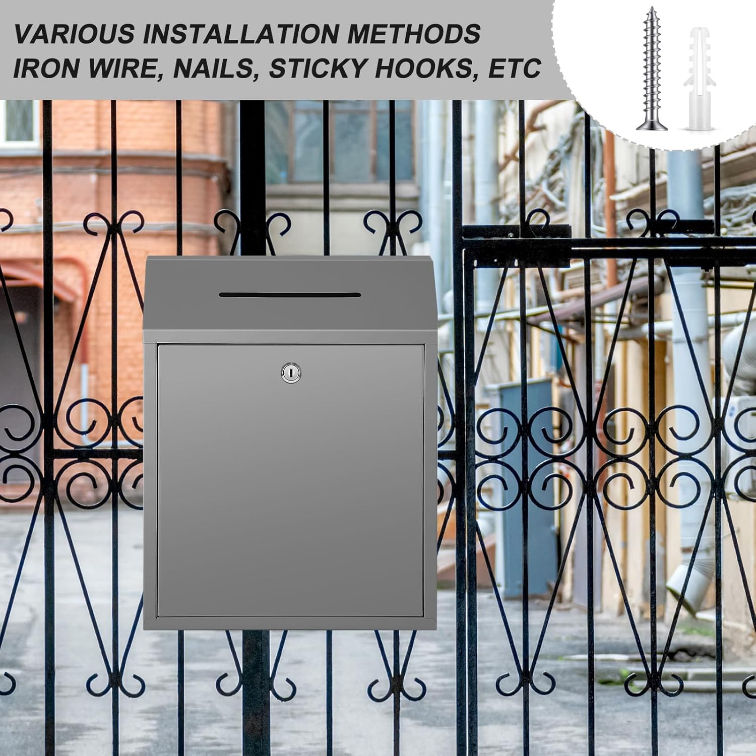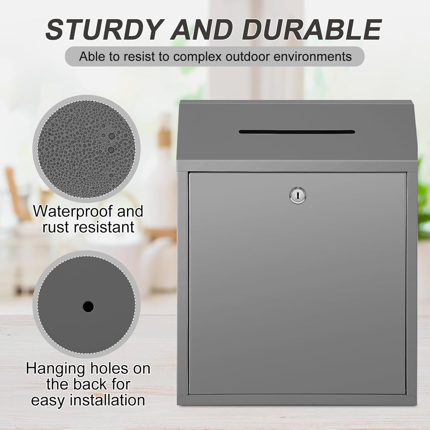 Metal Donation Cash Box Collection Safe Suggestion Box with Lock Wall Mounted Mailbox Delivery Ballot Container for Home Office Outdoor Door(Grey,15 x 12 x 4 Inch)